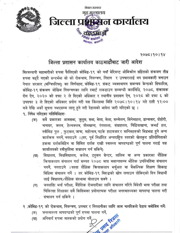 त्यस्तै विश्वविद्यालय, विद्यालयमा भौतिक उपस्थितिमा पठनपाठन नगर्ने आदेशलाई माघ मसान्तसम्म लम्ब्याइएको छ । बैठकले स्कुल तथा कलेजहरु आगामी माघ मसान्तसम्म भर्च्युअल रुपमै सञ्चालन गर्ने निर्णय गरेको हो । फिल्म हल र रात्रिकालीन व्यवसाय पनि माघ मसान्तसम्म बन्द रहने आदेशमा उल्लेख छ ।