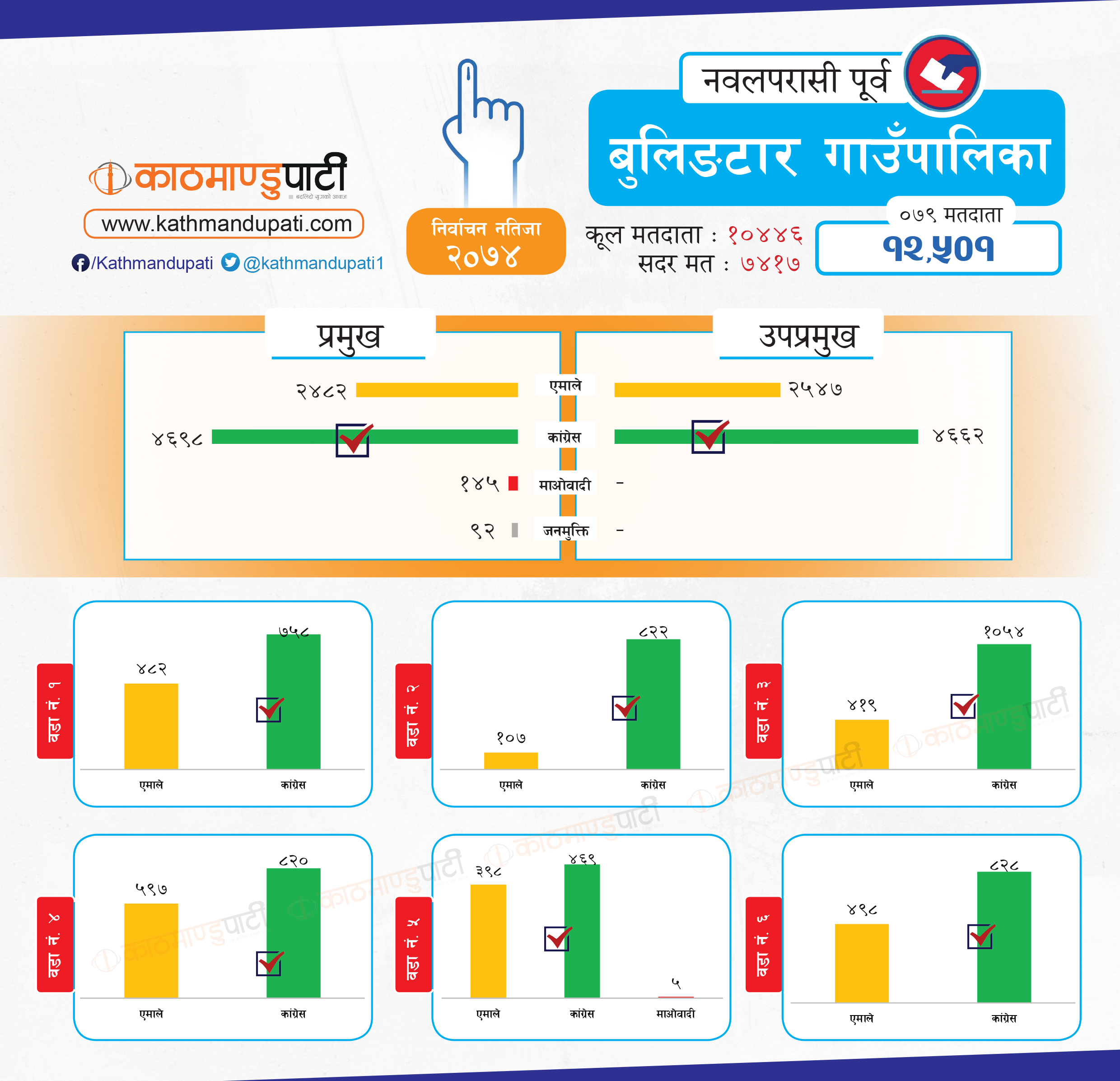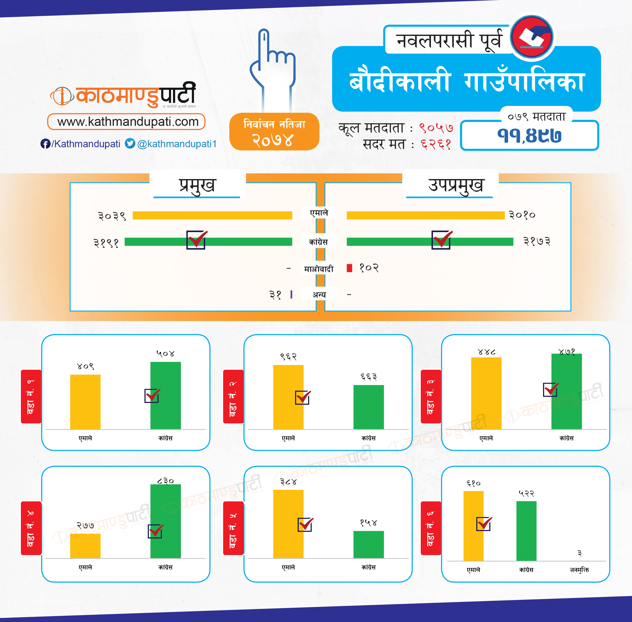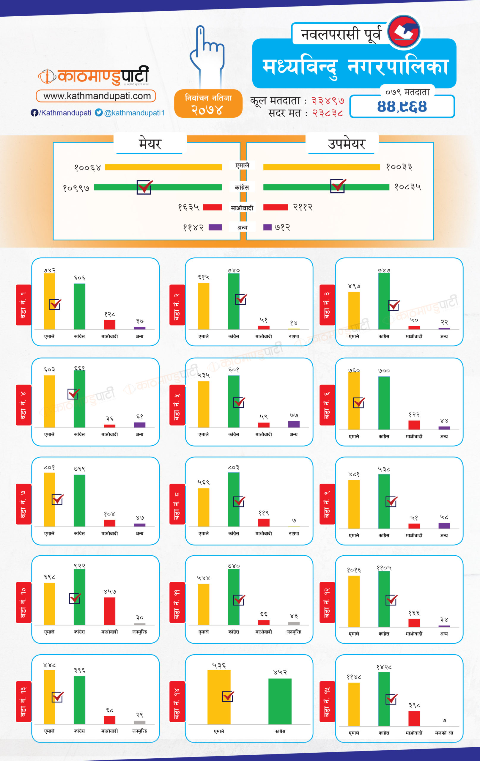 कांग्रेसले मध्यविन्दु नगरपालिकाको मेयर–उपमेयरसहित बौंदीकाली, बुलिङटार र विनयी–त्रिवेणी गाउँपालिकामा अध्यक्ष–उपाध्यक्ष जितेको थियो । यस्तै, उसले देवचुली नगरपालिकाको मेयर, हुप्सेकोट गाउँपालिकाको अध्यक्ष तथा गैँडाकोट नगरपालिकाको उपमेयर पनि जित्यो ।