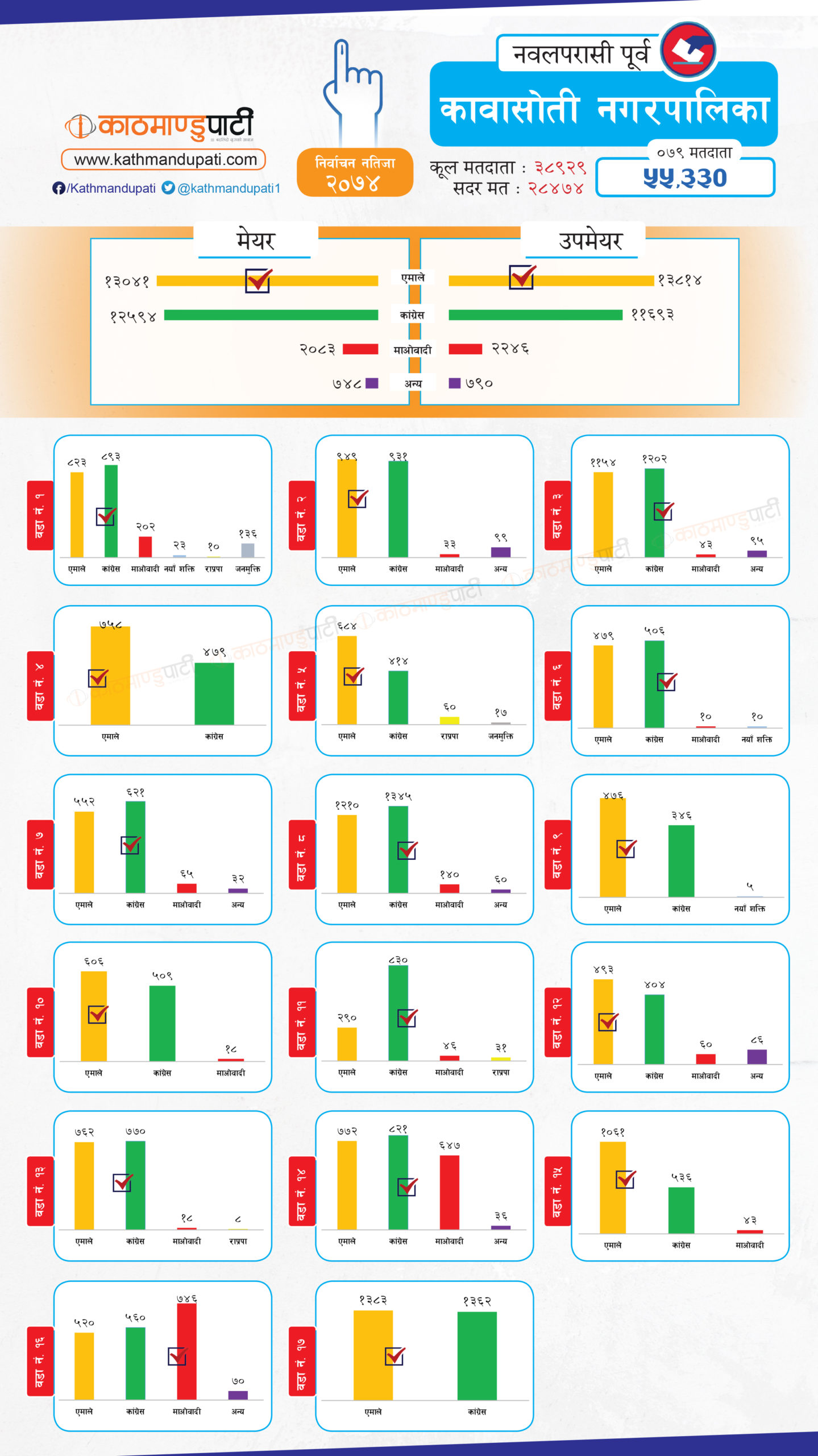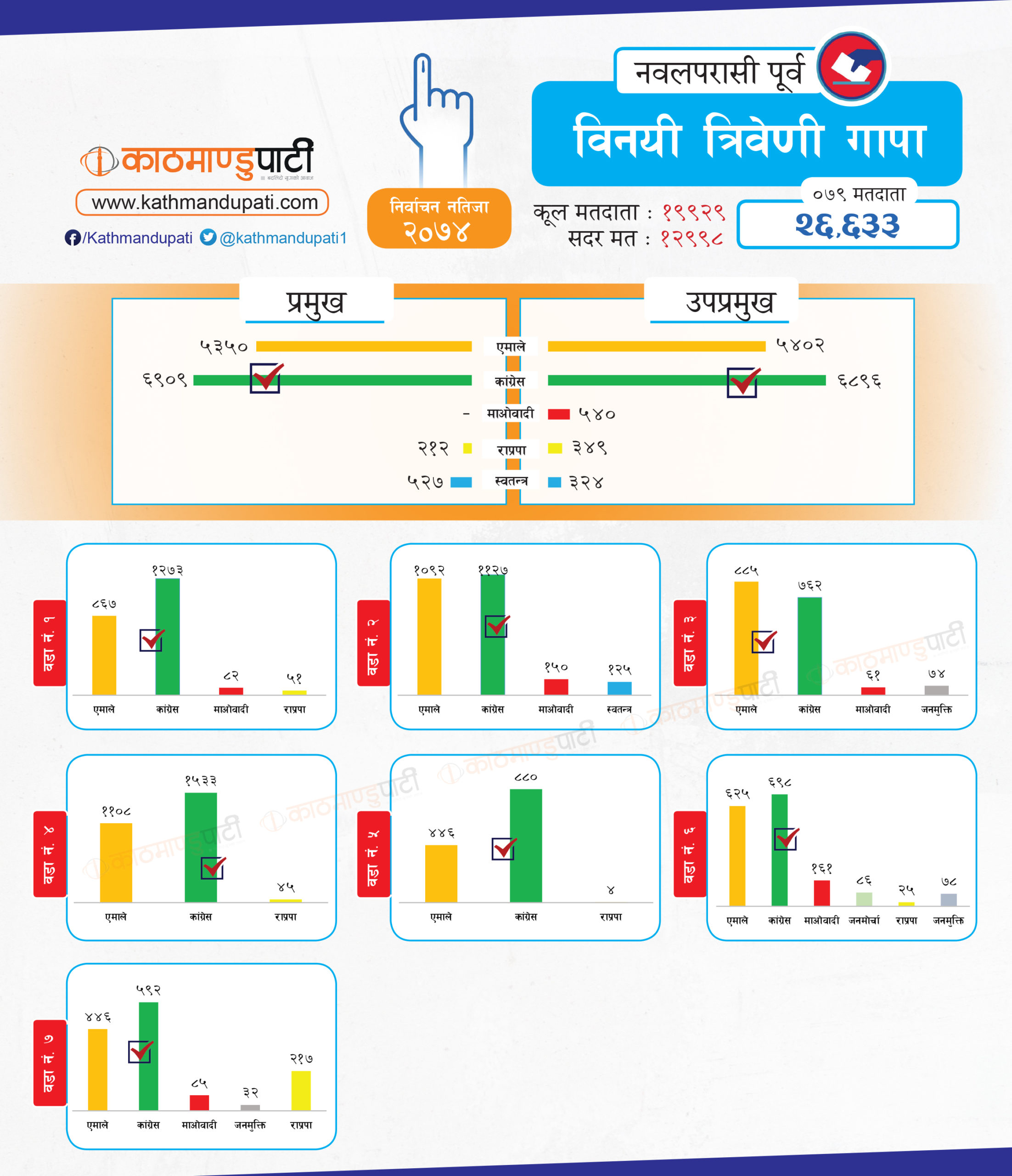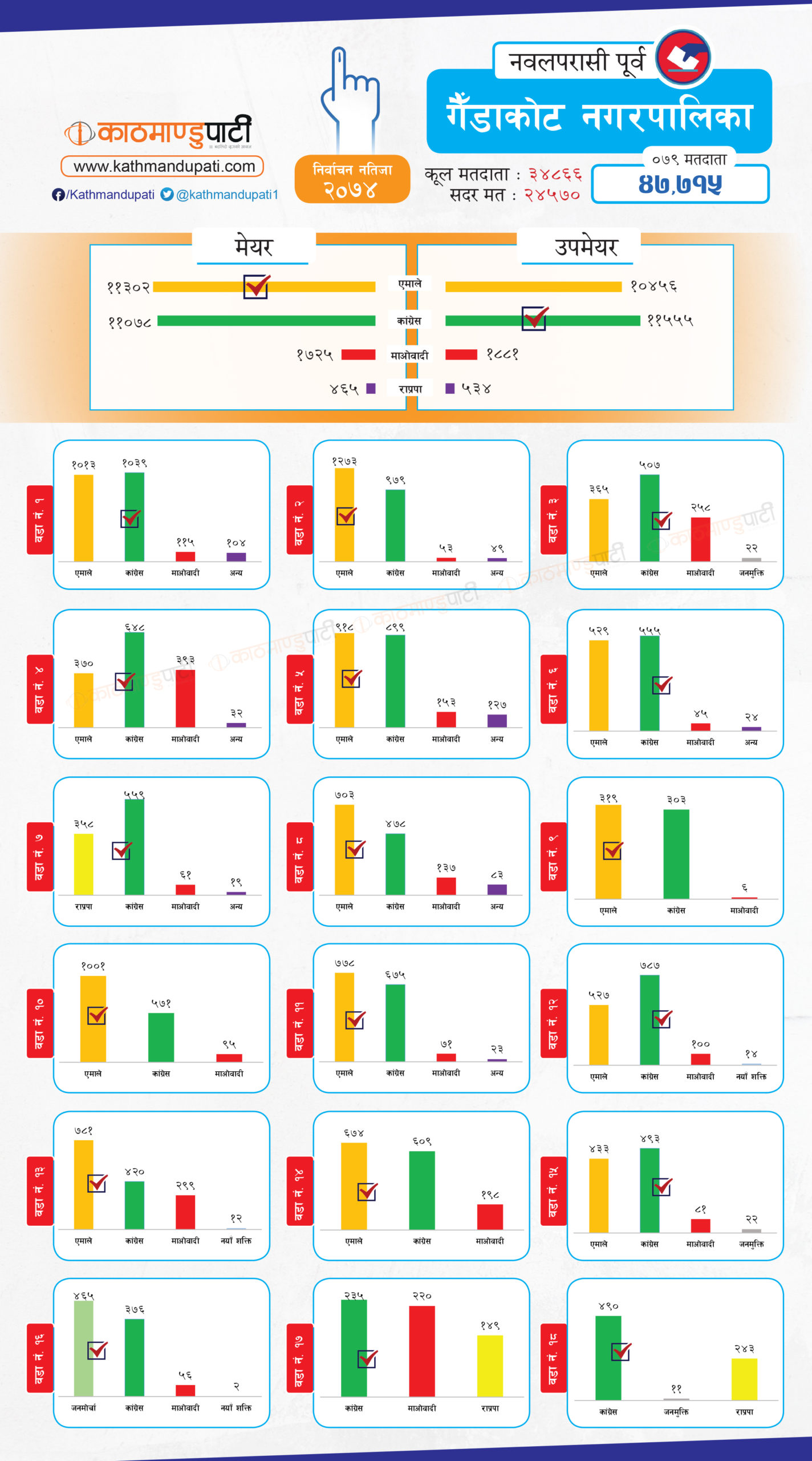 एमालेले कावासोती नगरपालिकाको मेयर–उपमेयर, गैँडाकोटको मेयर, देवचुलीको उपमेयर तथा हुप्सेकोटको उपाध्यक्ष जितेको थियो ।कांग्रेसको प्रभाव क्षेत्र मानिएको गैँडाकोटमा गत चुनावमा आश्चर्यजनक रूपमा मेयरमा बाजी मारेको थियो । जिल्लामा माओवादी कमजोर छ । केही पालिकामा भने उसको मत निर्णायक अवस्थामा छ ।