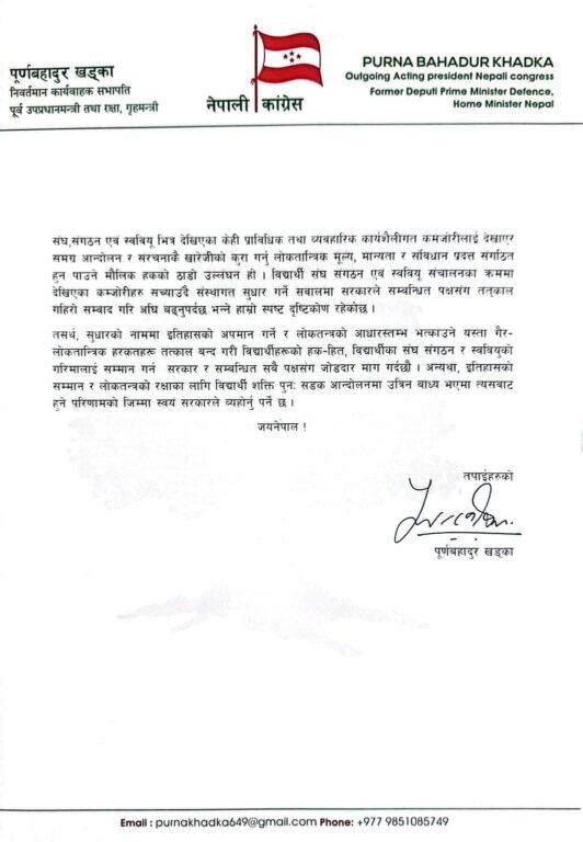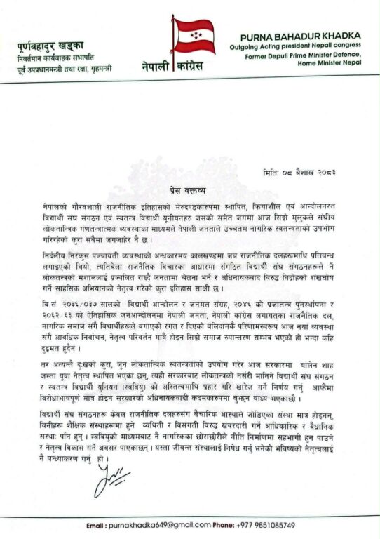 पहिलो पटक कांग्रेसको ‘निवर्तमान कार्यवाहक सभापति’को हैसियतमा विज्ञप्ति जारी गर्दै खड्काले सरकारलाई विद्यार्थी संघ–संगठन माथि हस्तक्षेप नगर्न चेतावनी दिएका हुन्।