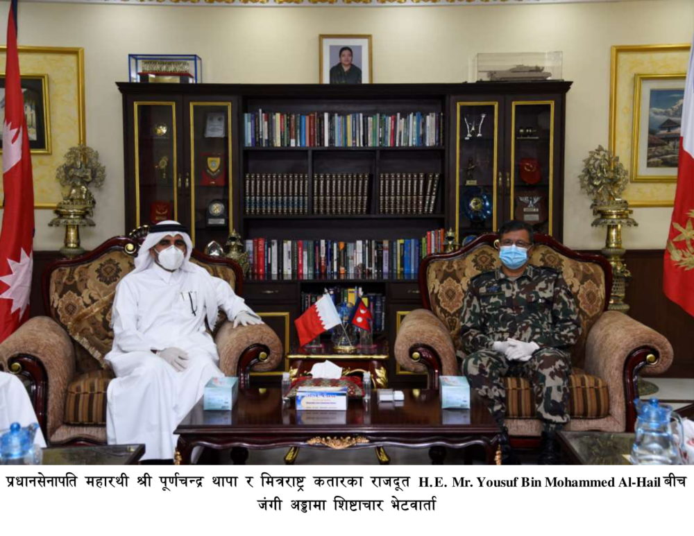 काठमाण्डु – प्रधानसेनापति पूर्णचन्द्र थापा र कतारका राजदूत युसुफ विन मोहम्मद अलहेलबीच भेटवार्ता भएको छ । सोमबार जंगी अड्डामा प्रधानसेनापति र राजदूतबीच शिष्टाचार भेटवार्ता भएको नेपाली सेनाले जनाएको छ ।