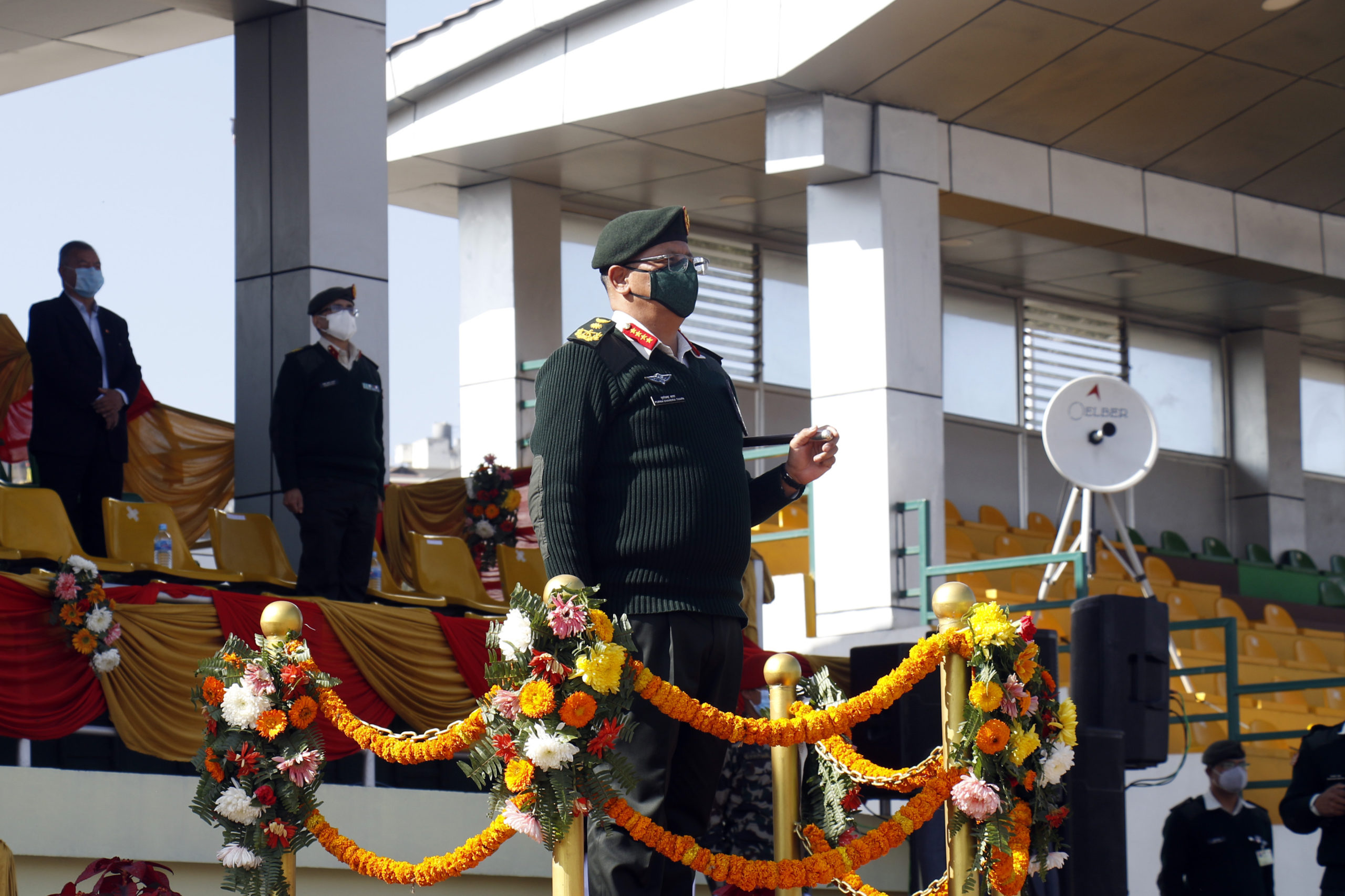 काठमाण्डु– नेपाली सेना सैनिक तालिम तथा डक्ट्रिन महानिर्देशनालय बलाधिकृत विभागको आयोजनामा काठमाण्डुको भद्रकाली खेल मैदानमा बुधबार भएको ‘प्रधान सेनापति ट्रफी २०७७ ’ को उद्घाटन समारोहमा सहभागी हुँदै प्रधान सेनापति पूर्णचन्द्र थापा ।