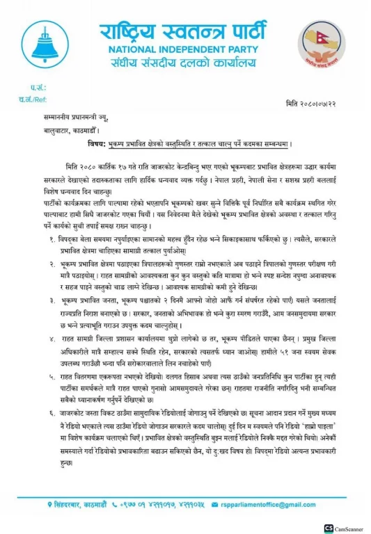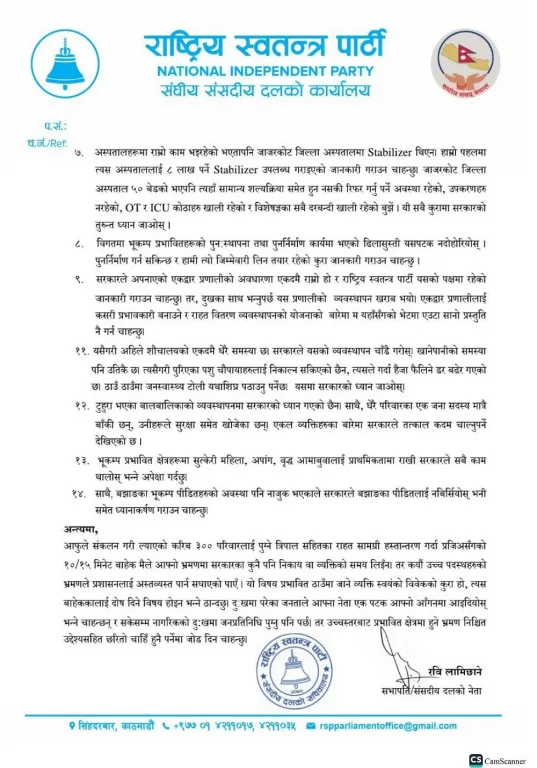 भूकम्प प्रभावित जाजरकोट र रुकुम (पश्चिम) बाट फर्किएलगत्तै बालुवाटार पुगेर सभापति लामिछानेले पीडितले तत्काल भोगेका समस्या र थप बन्दोबस्तीबारे प्रधानमन्त्रीलाई १४ बुँदे सुझाव दिएका हुन्।