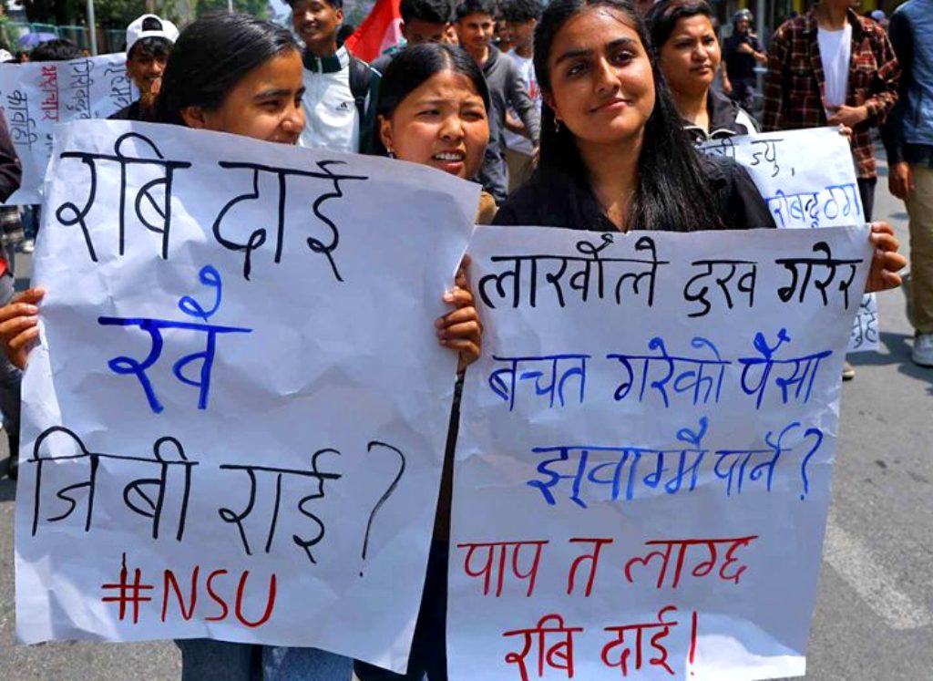 रवि दाई दोषी भए राजनीति छोड्ने रे । दोर्षी प्रमाणीत हुन त छानिबिन हुनु पर्ला नी ?, रवि दाई, खै जिबी राई , लाखौँले दुख गरेर बचल गरेको पैसा झ्वाम्मै पार्ने, पाप त लाग्छ रवि दाई ? लेखिएका प्ले कार्डसहित प्रदर्शनकारीहरुले नाराबाजी गरेका छन् ।