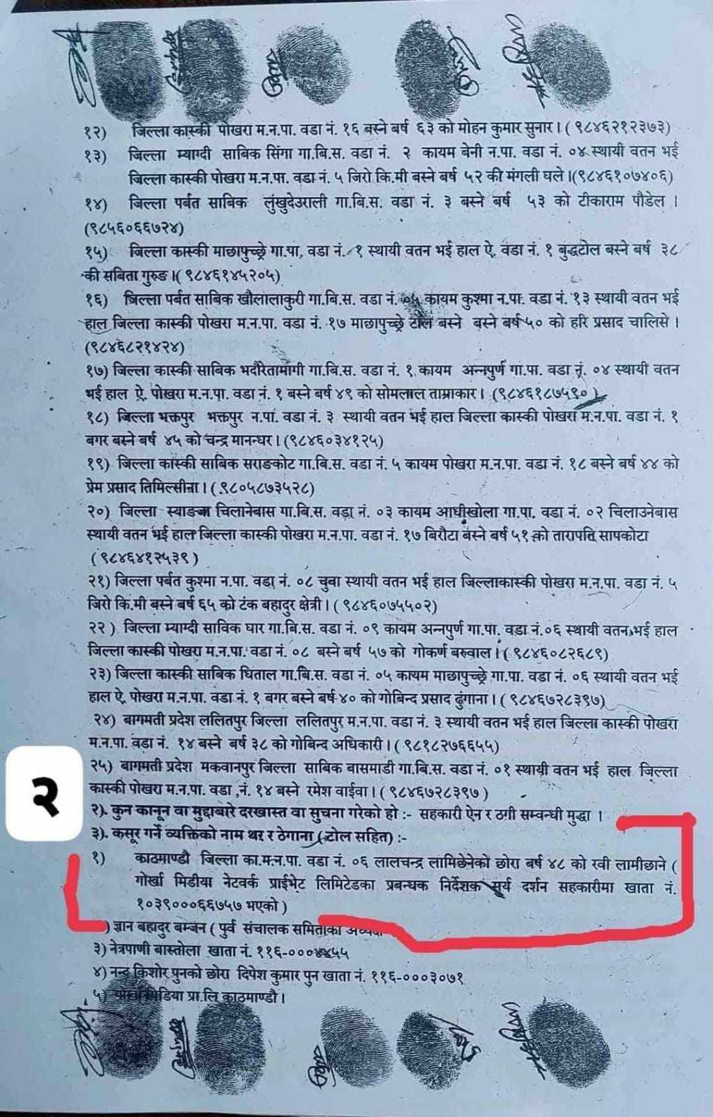 पोखरास्थित सूर्यदर्शन सहकारीका पीडितहरूले गृहमन्त्री लामिछानेसहित ४ जनाको नाम र ठेगाना नै किटान गरी गत माघ २२ गते कास्की प्रहरीमा जाहेरी दिएका थिए। २५ जना पीडितले हस्ताक्षर र ल्याप्चे लगाई पेस गरेको निवेदनको एक नम्बरमा नै रविको नाम स्पष्टरुपमा उल्लेख गरिएको छ । सहकारी ऐन र ठगीसम्बन्धी कानुनका आधारमा दिइएको निवेदनको कसुर गर्ने व्यक्तिको नाम, थर ठेगाना भन्ने शीर्षकमा स्थायी ठेगाना काठमाण्डु जिल्ला कामनपा वडा नम्बर ६, वर्ष ४८ को रवि लामिछाने (गोर्खा मिडिया नेटवर्क प्राइभेट लिमिटेडका प्रबन्ध निर्देशक, सूर्यदर्शन सहकारीमा खाता नम्बर १०३९०००६६७५७ भएको ) भन्ने किटानी गरिएको छ।