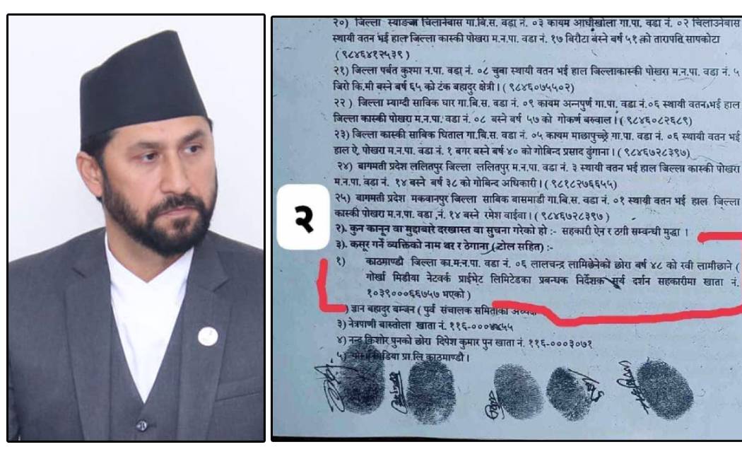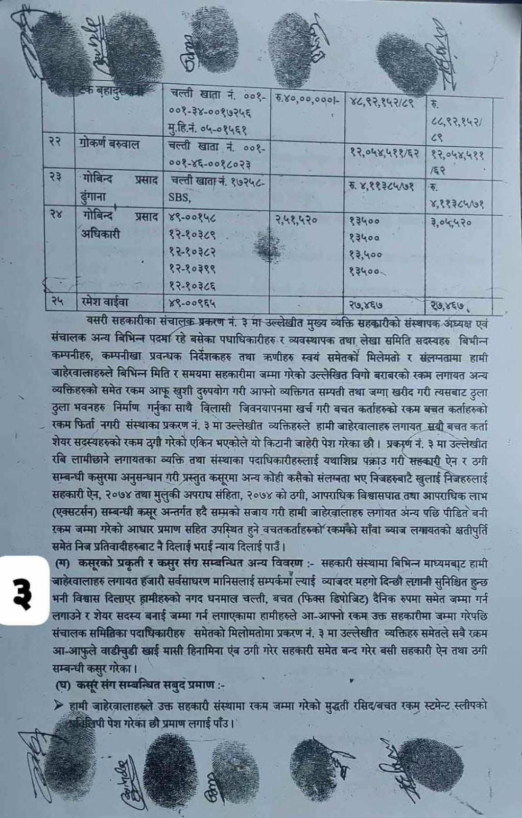 जाहेरीमार्फत लामिछानेलगायतका व्यक्ति तथा संस्थाका पदाधिकारीलाई पक्राउ गरेर सहकारीसम्बन्धी कसुरमा अनुसन्धान गर्नुपर्ने माग गरिएको छ ।