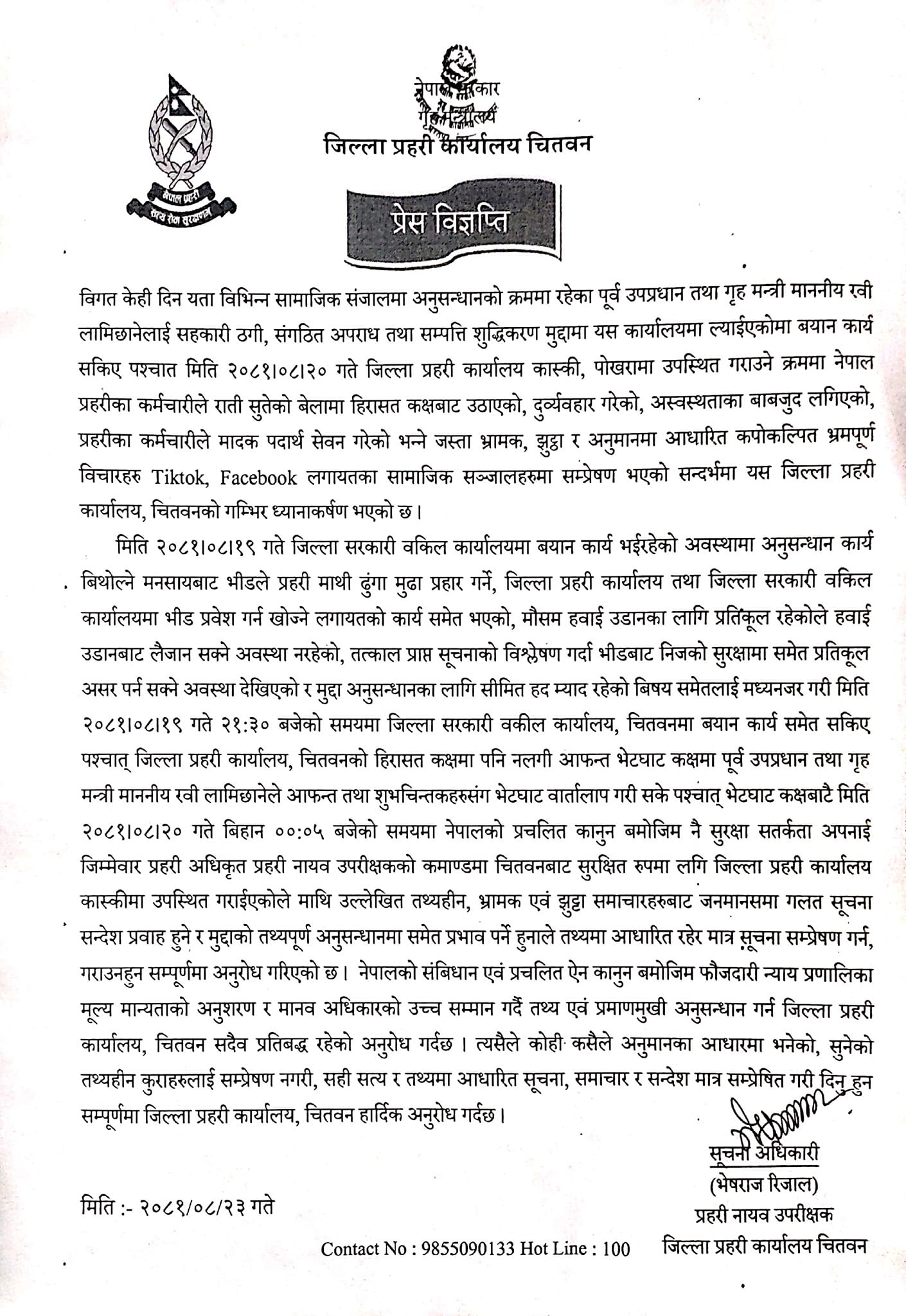 आईतबार प्रेस विज्ञप्ति जारी गर्दै चितवन प्रहरीले चितवनको बयान सकेर मध्यरात नै कास्कीतर्फ लगिएका रवि लामिछानेमाथि अमानवीय व्यवहार नभएको दाबी गरेको छ ।