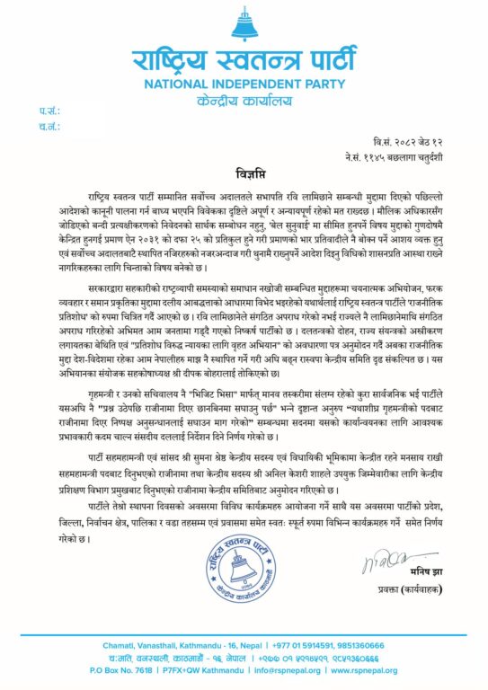 काठमाण्डु – राष्ट्रिय स्वतन्त्र पार्टी (रास्वपा) ले सभापति रवि लामिछानेको ‘प्रतिशोधविरुद्ध न्यायका लागि बृहत् अभियान’ गर्ने निर्णय गरेको छ ।