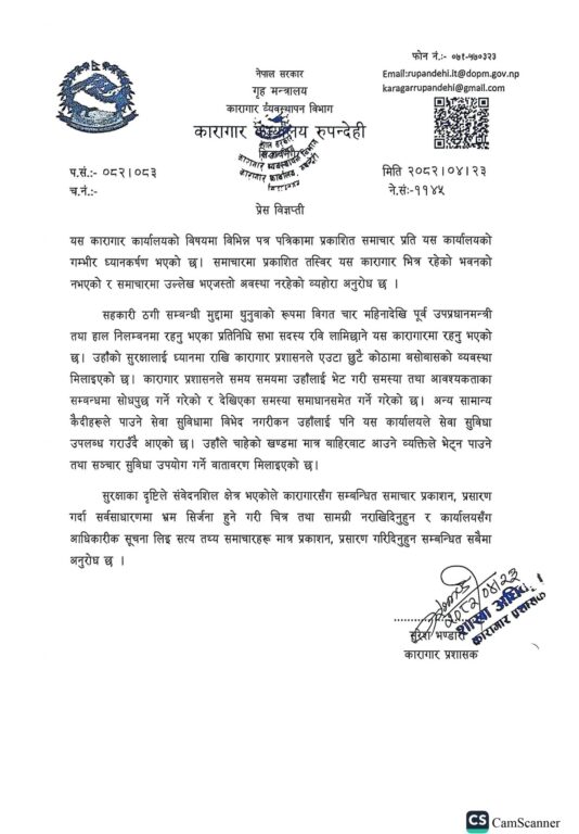 काठमाण्डु– सहकारी ठगी मुद्दामा चैत २५ देखि रुपन्देही कारागारमा थुनामा रहेका रास्वपा अध्यक्ष तथा पूर्वगृहमन्त्री रवि लामिछानेबारे मिडियामा आएका विभिन्न समाचारप्रति कारागार प्रशासनले प्रतिक्रिया दिएको छ।