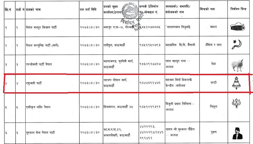 लामिछानेले राजेको चुनाव चिन्ह घण्टी राष्ट्रवादी पाटीले यसअघि नै पाइसकेको छ । नारायण गोपाल मार्ग काठमाण्डुमा कार्यालय रहेको यस पार्टी २०७३ साल मंसिर ३० गते आयोगमा दर्ता भएको हो ।