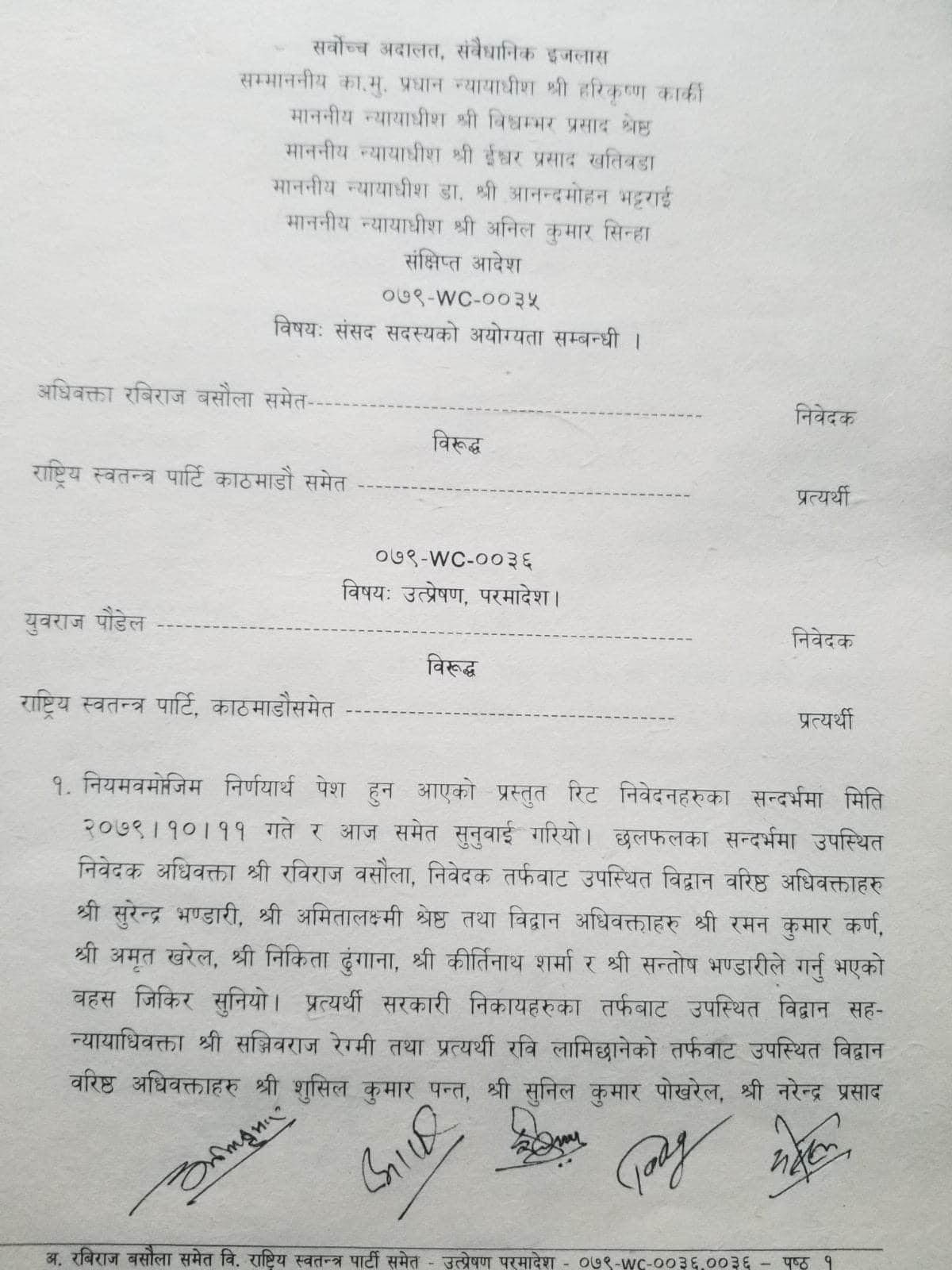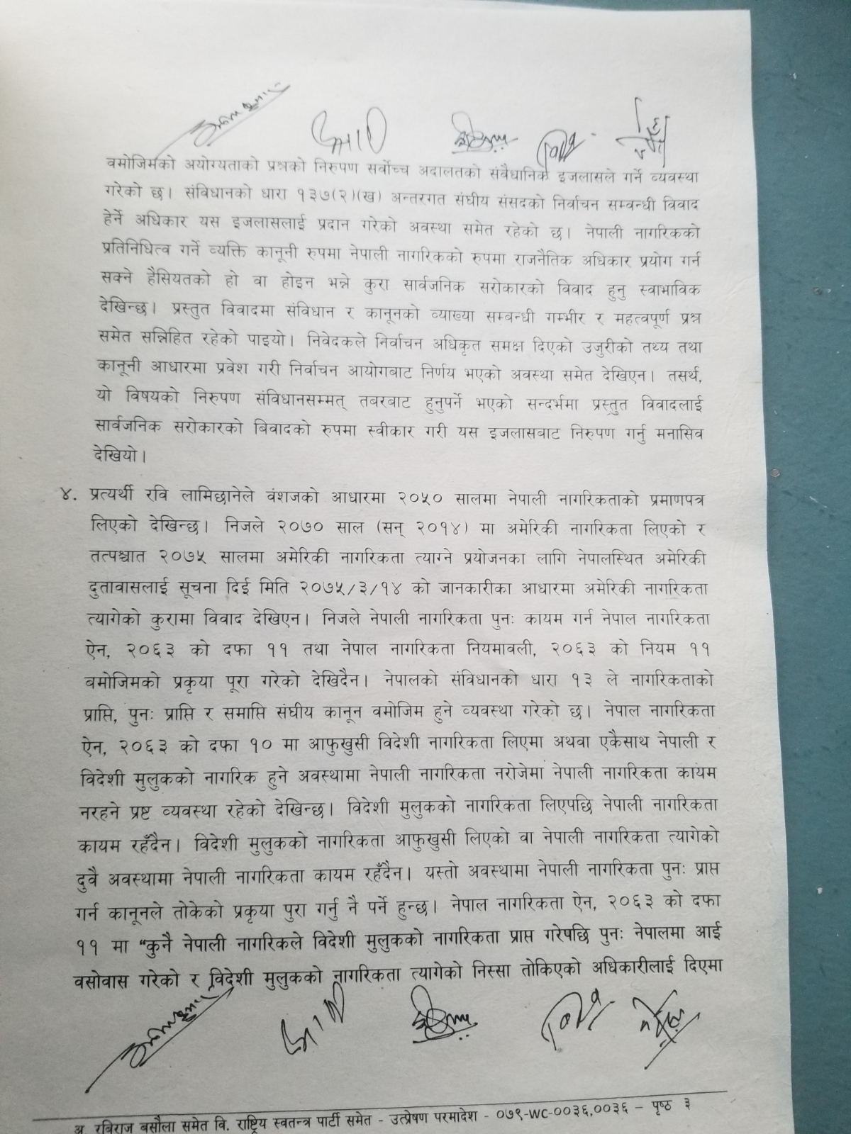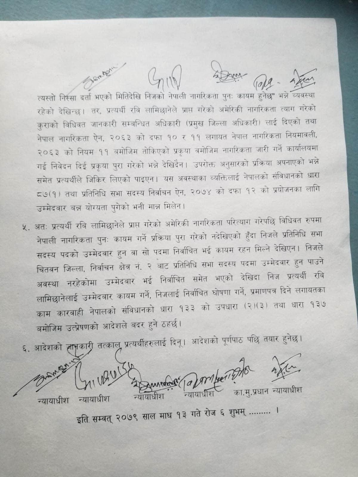 लामिछाने गत मंसिरमा भएको निर्वाचनमा चितवन २ बाट निर्वाचित भएका थिए । नागरिकताका विषमया लामिछानेलाई विपक्षी बनाउदै रविराज बसौला र युवराज सफलसहितले मुद्दा दायर गरेका थिए ।
