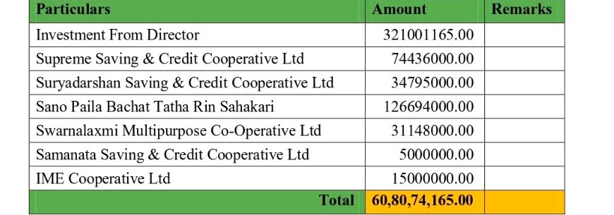 लेखा परीक्षण प्रतिवेदनमा पनि सहकारीसँग ऋण लिएको कतै उल्लेख छैन । नयाँ कम्पनीमा कयौँ व्यक्ति, भेण्डर, वित्तीय संस्थाहरूलाई उनीहरूसँग गरिएको सम्झौता एवम् कार्यकारी अध्यक्ष तथा लगानीकर्ता गितेन्द्र बाबु राईको निर्देशनमा अनगिन्ती चेकहरू मार्फत भुक्तानी गएको थियो । हरेक भुक्तानीको प्रकृया लगानीकर्ता गितेन्द्र बाबु राईले आफ्नो नियन्त्रणमा राखी तह तहमा भेरीफाई (क्लियरिङ) गरी चेक जारी वा हस्ताक्षर गराउथे। हरेक चेकहरूसँग ती चेकहरू दिनु पर्ने कारण सहितको सपोर्टिङ डकुमेण्ट, विल भौचर हुन्थे अथवा त्यस्तो नभएको अवस्थामा कार्यकारी अध्यक्षको निर्देशनबाट पनि चेकहरू दिइने प्रचलन हुन्थ्यो । त्यसमाथि मेरो कार्यकालमा उल्लिखित सहकारीहरूबाटकुनै ऋण लिने निर्णय भएको छैन, सहकारीबाट रकम ल्याउने विषयमा मसँग औपचारिक वा अनौपचारिक रूपमा सञ्चालक कोही कसैले कुनै पनि तवरबाट जानकारी वा सूचना गराईएको छैन/थिएन।