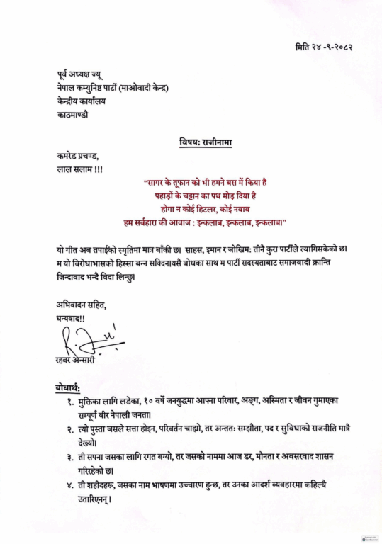 संयोजक प्रचण्डलाई बुझाइएको राजीनामा पत्रमा भनिएको छ, ‘साहस, इमान र जोखिम तीनै कुरा पार्टीले त्यागिसकेको छ । म यो विरोधाभासको हिस्सा बन्न सक्दिनँ । यसै बोधका साथ म पार्टी सदस्यताबाट समाजवादी क्रान्ति जिन्दावाद भन्दै बिदा लिन्छु ।’