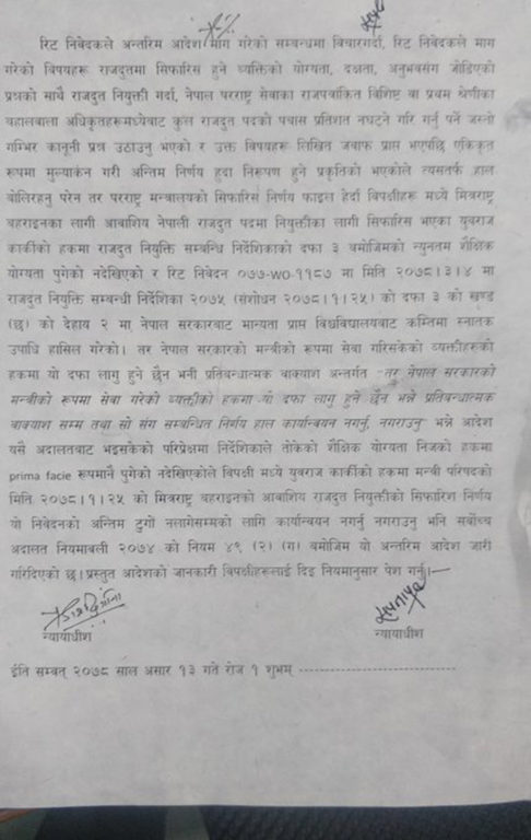राजदूतको योग्यतासम्बन्धी परेको रिट निवेदनमा न्यायाधीशद्वय सपना प्रधान मल्ल र प्रकाश ढुंगानाको इजलासले स्नातक नगरेको व्यक्तिलाई राजदूत नियुक्त नगर्न अन्तरिम आदेश दिएको हो ।
