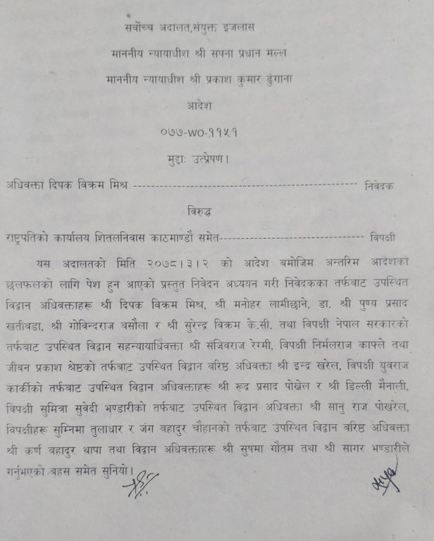 राजदूतको योग्यतासम्बन्धी परेको रिट निवेदनमा न्यायाधीशद्वय सपना प्रधान मल्ल र प्रकाश ढुंगानाको इजलासले स्नातक नगरेको व्यक्तिलाई राजदूत नियुक्त नगर्न अन्तरिम आदेश दिएको हो ।