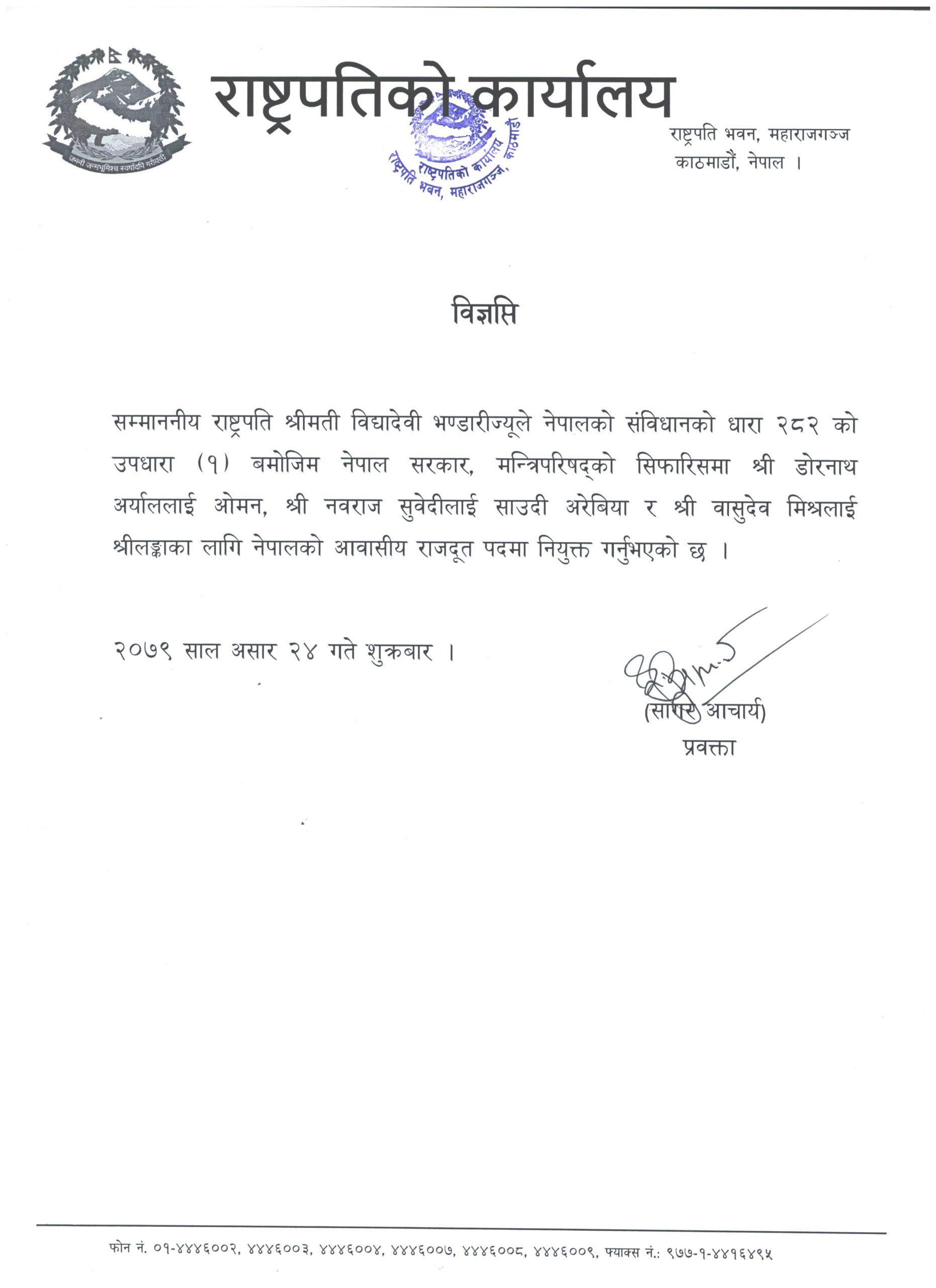 साउदी अरेबियाका लागि नेपाली राजदूतमा नवराज सुवेदी, ओमानका लागि डोरनाथ अर्याल र श्रीलंकाका लागि नेपाली राजदूतमा वासुदेव मिश्र नियुक्त भएका छन् ।