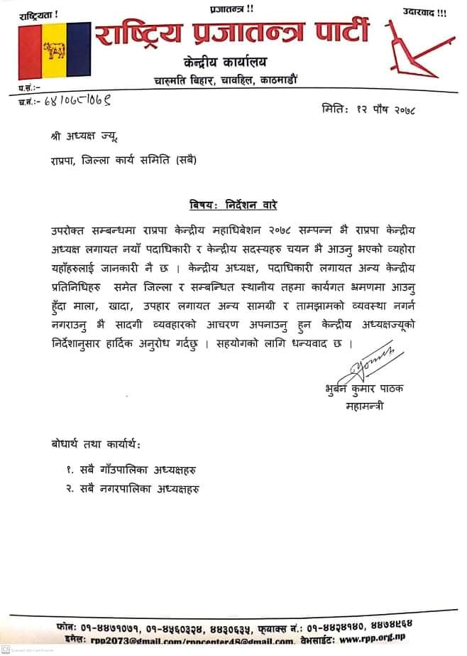 पार्टीका अध्यक्ष, पदाधिकारी, केन्द्रीय सदस्य, प्रतिनिधिहरू जिल्लाको भ्रमणमा जाँदा वा स्थानीय तहका कार्यक्रममा माला, खादा, उपहार तथा कुनै किसिमको तामझाम नगर्न, सादगी व्यवहार आचरण अपनाउन मातहतका निकायलाई अध्यक्षको निर्देशानुसार सर्कुलर गरिएको राप्रपाले जनाएको छ ।