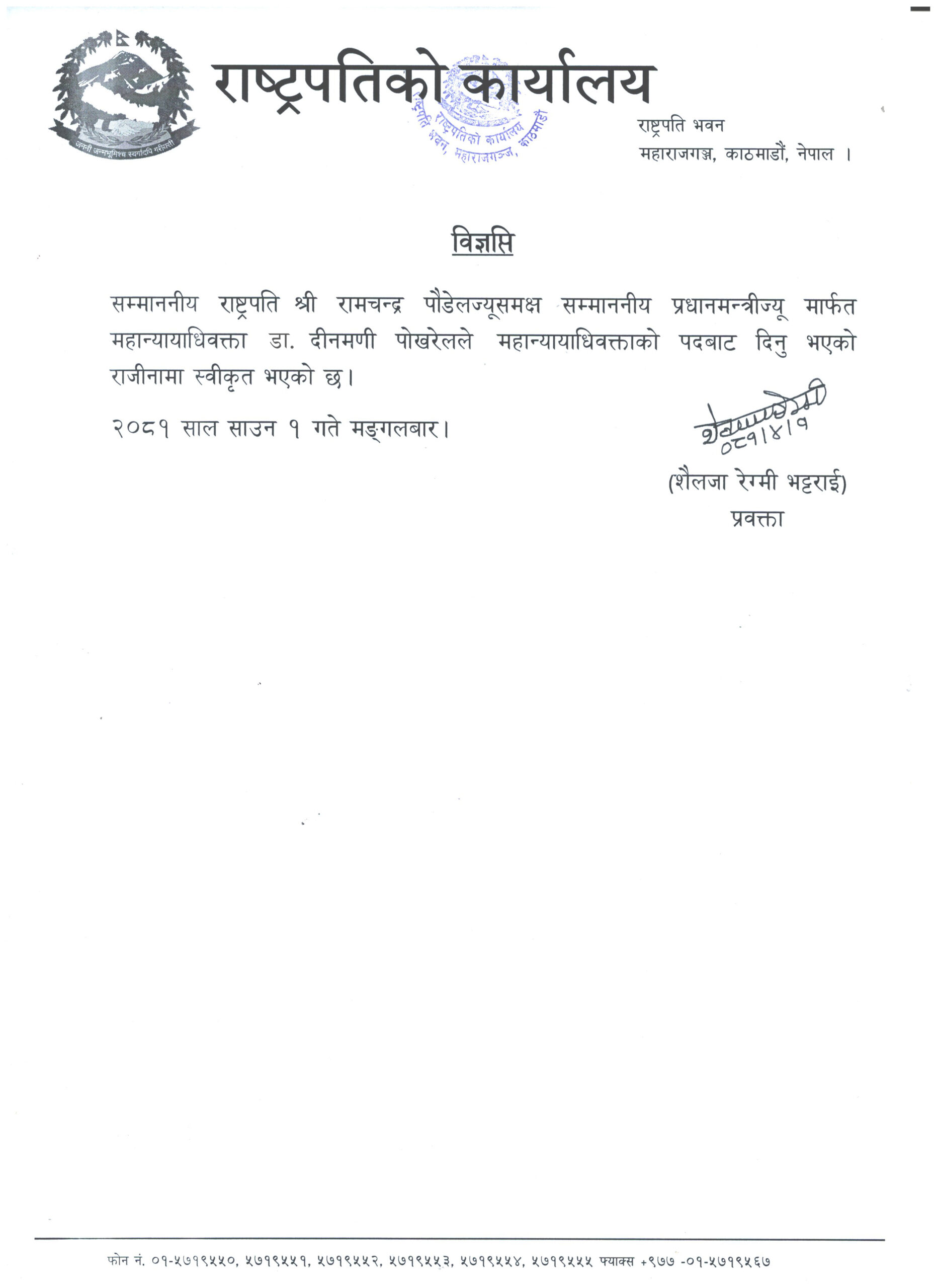 काठमाण्डु – राष्ट्रपति रामचन्द्र पौडेलले महान्यायाधिवक्ता डा. दीनमणी पोखरेलले दिएको राजीनामा स्वीकृत गरेका छन् ।