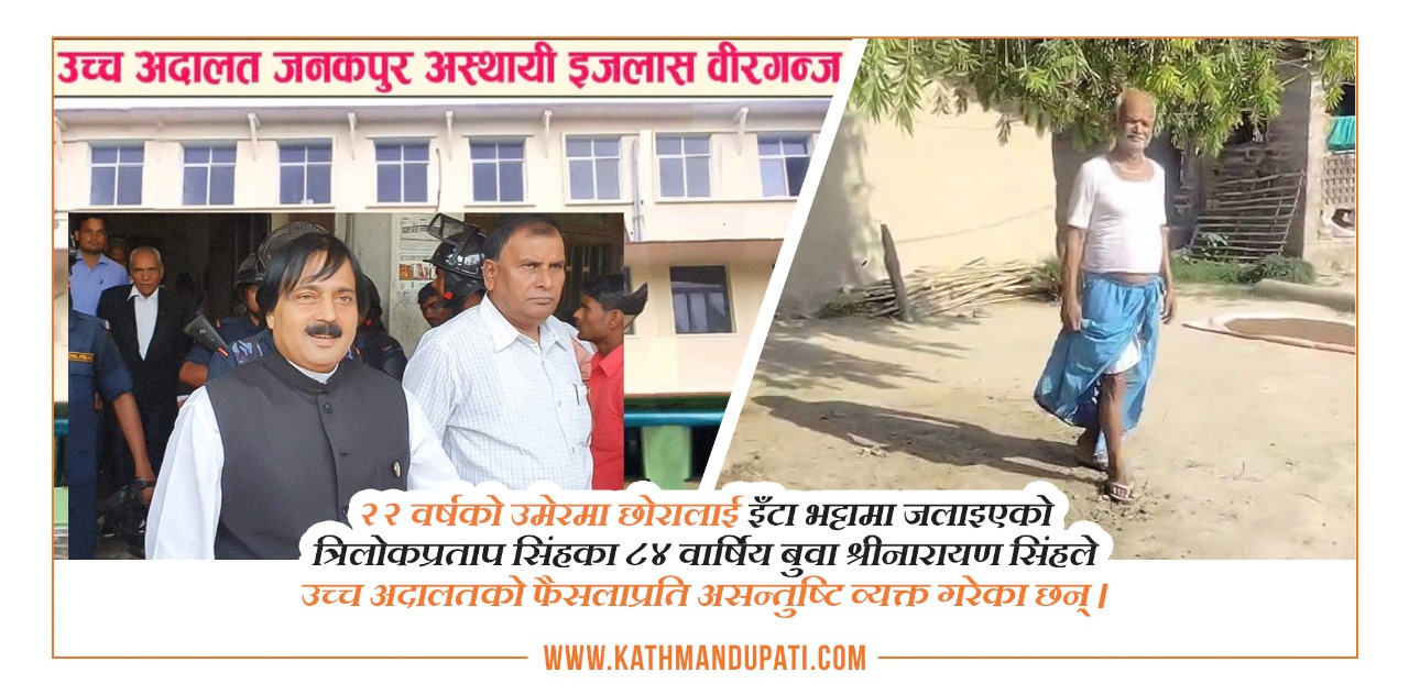 २२ वर्षको उमेरमा छोरालाई इँटा भट्टामा जलाइएको त्रिलोकप्रताप सिंहका ८४ वार्षिय बुवा श्रीनारायण सिंहले उच्च अदालतको फैसलाप्रति असन्तुष्टि व्यक्त गरेका छन् । उच्च अदालत वीरगंज इजलासले मोहम्मद आफताब आलमलाई रिहा गर्ने फैसला गरेपछि सिंहले सर्वोच्च अदालत जाने बताए ।