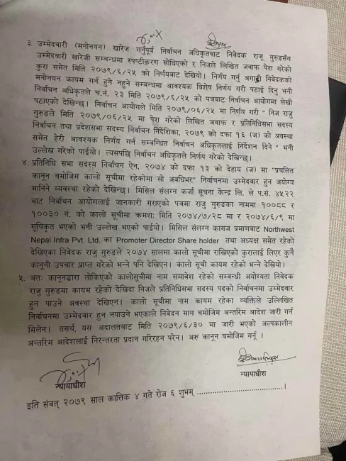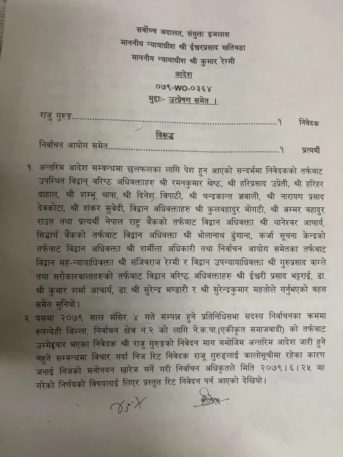 शुक्रवार दुवै पक्षको वहसपछि न्यायाधीश ईश्वर खतिवडा र कुमार रेग्मीको इजलासले गुरुङको उम्मेदवारी कानूनविपरित देखिएको भन्दै अल्पकालीन अन्तरिम आदेश निरन्तर जान नसक्ने भनेको छ । सर्बोच्चको यो आदेशसँगै गुरुङ अब उम्मेदवार रहेनन् ।