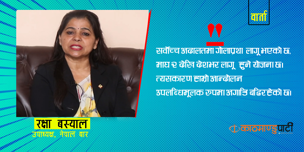 प्रधानन्यायाधीश जबराले आफन्तका लागि सरकारसँग भागबन्डा मागेकाले अब इजलासमा बस्न पाउने अधिकार नभएको बारको अडान छ । यता जबरा पनि आफू कुनै पनि हालतमा राजीनामा नदिने अडानमा छन् । आन्दोलन गरेको लामो समयसम्म किन बारले ठोस प्रमाण पेस गर्न सकेन ? प्रमाणको आधारमा प्रक्रिया अगाडि बढाउने कानुन व्यवसायीहरूले प्रमाण बिना आन्दोलन गर्नुको कारण के हो ? जबराको राजीनामालाई बटमलाइन बनाएको बारको आन्दोलनले हालसम्म के उपलब्धि गरेको छ ? यिनै विषयमा केन्द्रित रहेर नेपाल बार उपाध्यक्ष रक्षा बस्यालसँग काठमाण्डुपाटीका लागि टक खातीले गरेको कुराकानीको सम्पादित अंशः