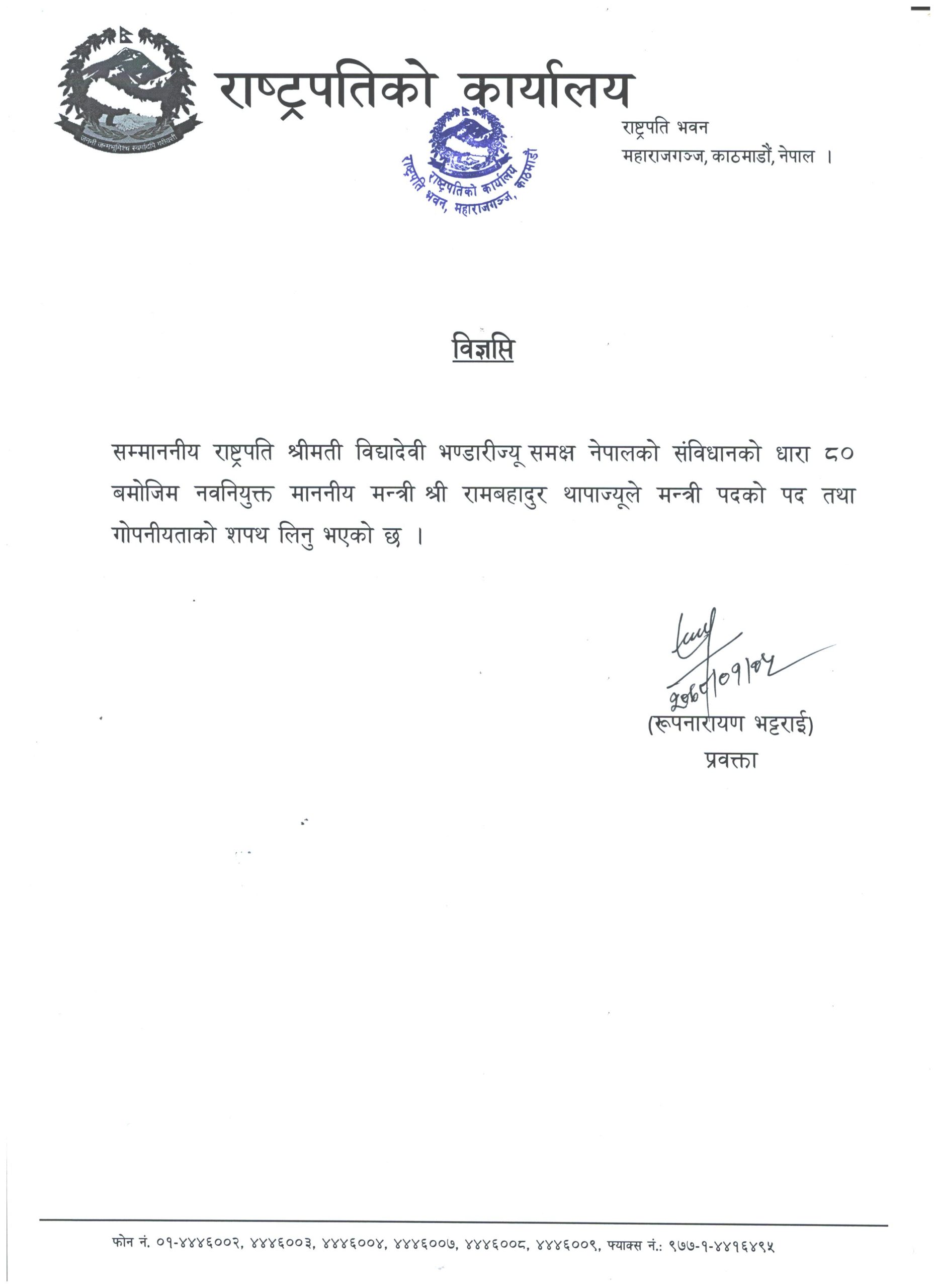 काठमाण्डु – गृहमन्त्री रामबहादुर थापा बादलले पद तथा गोपनियताको शपथ लिएका छन् । आइतबार साँझ राष्ट्रपति विद्यादेवी भण्डारीले गृहमन्त्री बादललाई शपथ ग्रहण गराएकी हुन् ।