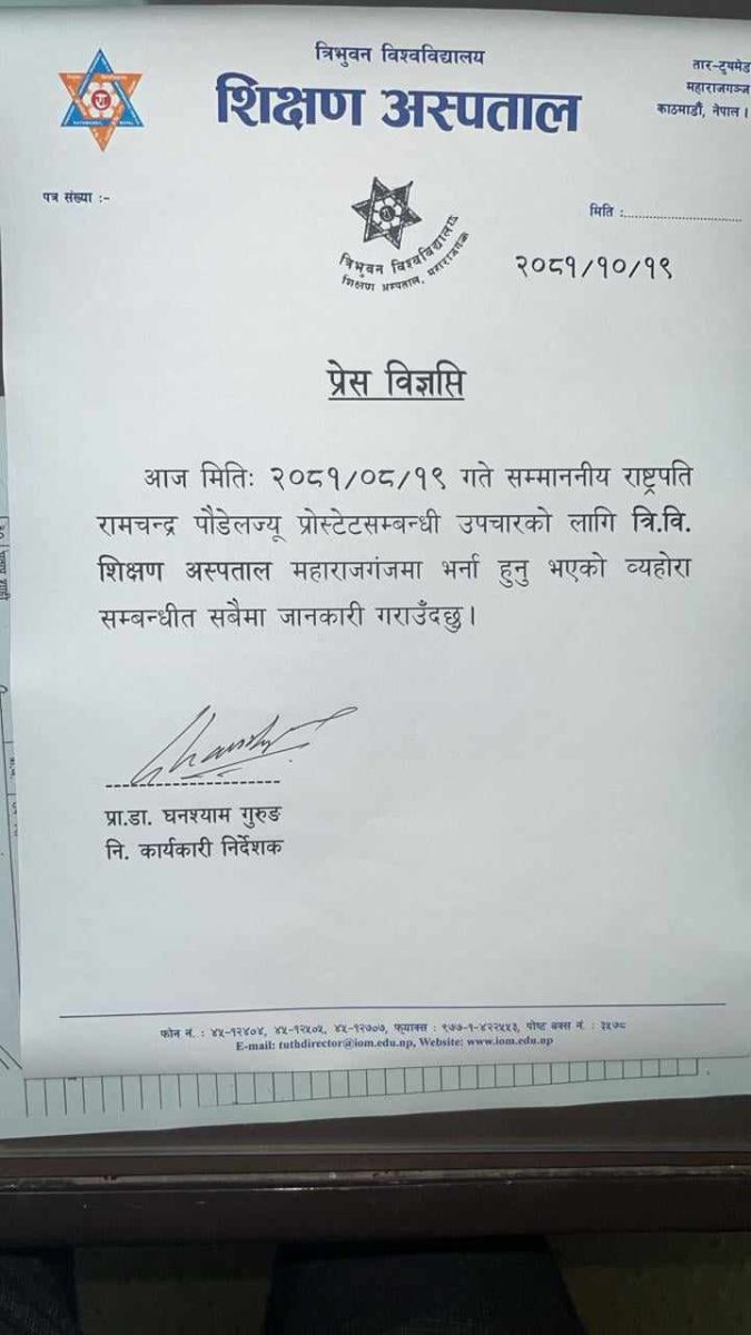 उनलाई प्रोस्टेटसम्बन्धी उपचारका लागि त्रिभुवन विश्वविद्यालय, शिक्षण अस्पतालमा भर्ना गरिएको हो ।