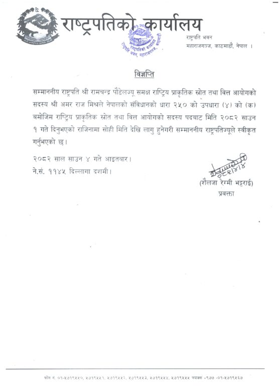 राष्ट्रपति पौडेलद्वारा वित्त आयोगका सदस्य मिश्रको राजीनामा स्वीकृत