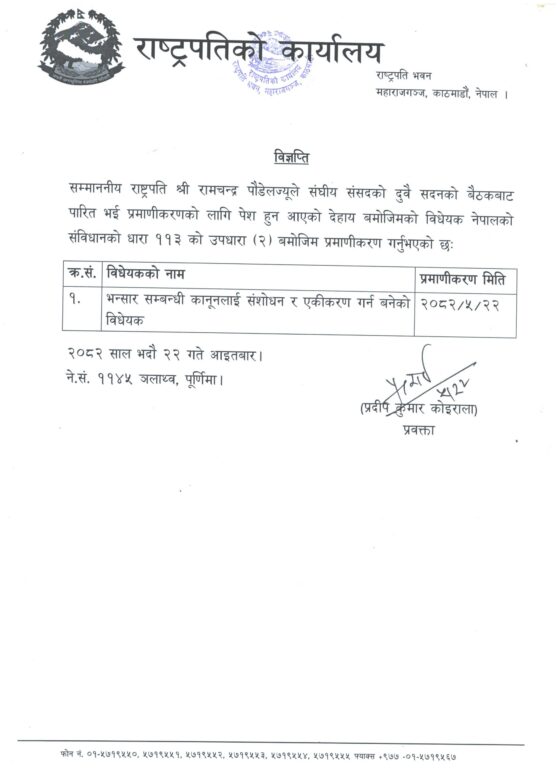 राष्ट्रपतिको कार्यालय महाराजगञ्जबाट आईतबार सार्वजनिक विज्ञप्तिअनुसार नेपालको संविधानको धारा ११३ को उपधारा (२) बमोजिम ‘भन्सार सम्बन्धी कानूनलाई संशोधन र एकीकरण गर्न बनेको विधेयक’ प्रमाणीकरण भएको हो ।