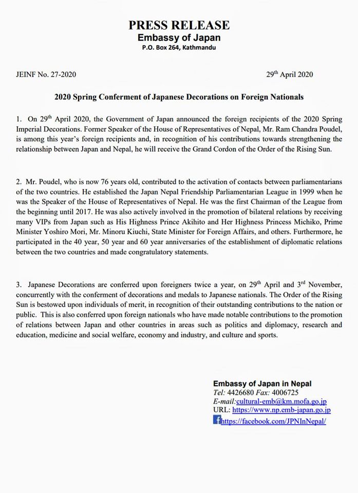 पूर्वसभामुखसमेत रहेका ७६ वर्षीय कांग्रेस नेता पौडेलले उक्त अवार्ड पाएपछि जापान सरकारलाई धन्यवाद दिएका छन् ।