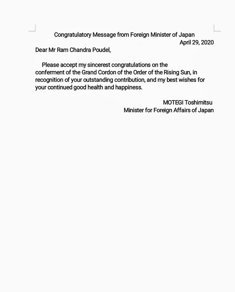 काठमाडौं – नेपाली कांग्रेसका वरिष्ठ नेता रामचन्द्र पौडेल जापान सरकारबाट उत्कृष्ण विभूषणबाट सम्मानित भएका छन् । नेता पौडेलले जापान ‘ग्राण्ड कार्डन अफ दि अर्डर अफ दि राईजिङ सन अवार्ड’ पाएका हुन् ।