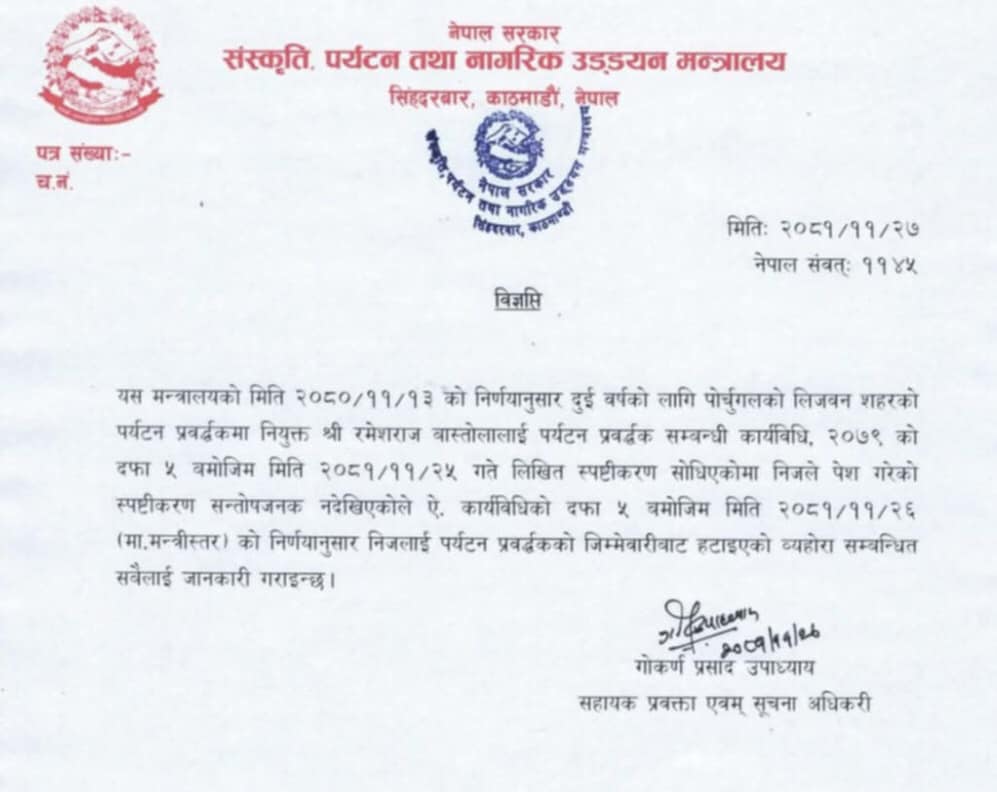 मन्त्रालयका सहायक प्रवक्ता तथा सूचना अधिकारी गोकर्ण प्रसाद उपाध्यायले मंगलबार विज्ञप्ति जारी गर्दै जिम्मेवारीबाट हटाइएको जनाएका छन् ।