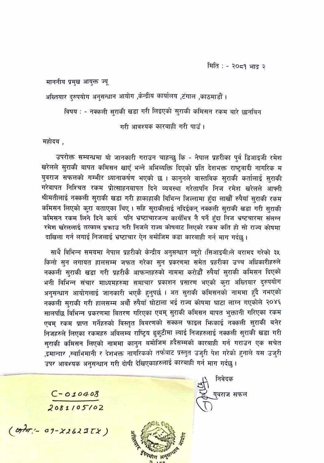 सही सुराकीलाई नदिइकन नक्कली सुराकी खडा गरी सुराकी रकम लिनदिने कार्य पनि भ्रष्टाचारजन्य कार्यमा पर्ने हुँदा खरेललाई तत्काल पक्राउ गरी भ्रष्टाचार ऐन बमोजिम कारबाही गर्न समेत माग गरेका छन् ।