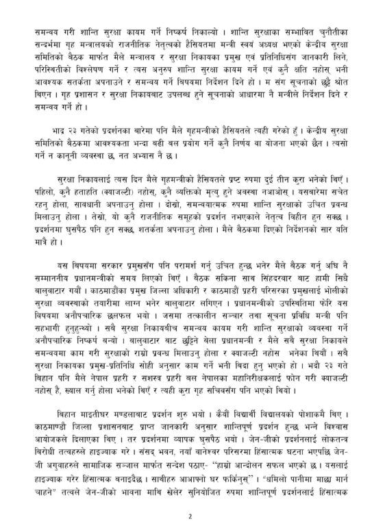 काठमाण्डु– गत भाद्र २३ र २४ गतेको घट्नाका तत्कालीन गृहमन्त्री रमेश लेखकले प्रदर्शनमा आफूले कुनैपनि बल प्रयोग र गोली चलाउने लिखित एवम मौखिक आदेश नदिएको स्पष्ट पारेका छन् ।