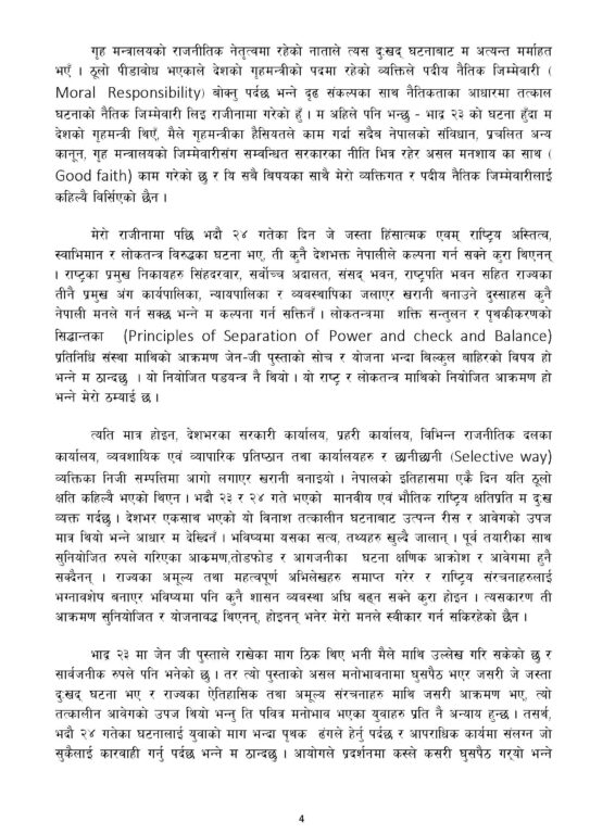 आफ्नो राजीनामा पछि भदौ २४ गतेका दिन जेजस्ता हिंसात्मक एवम् राष्ट्रिय अस्तित्व, स्वाभिमान र लोकतन्त्र विरुद्धका घटना भएको भन्दै त्यो घट्ना जेन–जी पुस्ताको सोच र योजना भन्दा बिल्कुल बाहिरको विषय रहेको धारणा राखे ।