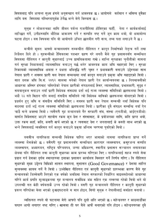 लेखकले देशमा अकल्पनीय घटना भएको अवस्थामा गृहमन्त्रीको हैसियतले नैतिक जिम्मेवारी लिदै मैले तत्काल राजीनामा गर्ने निर्णय गरेको बताए ।