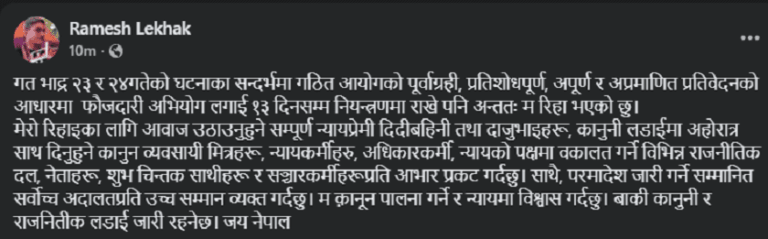 लेखकले लेखेका छन्, ‘गत भाद्र २३ र २४गतेको घटनाका सन्दर्भमा गठित आयोगको पूर्वाग्रही, प्रतिशोधपूर्ण, अपूर्ण र अप्रमाणित प्रतिवेदनको आधारमा फौजदारी अभियोग लगाई १३ दिनसम्म नियन्त्रणमा राखे पनि अन्ततः म रिहा भएको छु।’