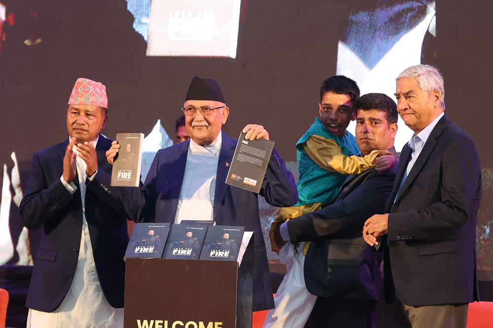 काठमाडौं हल्चोकमा एक समारोहका बीच द्वन्द्वकालमा नेपाली सेनाको एमआई–१७ हेलिकप्टरका प्रथम इन्स्ट्रक्टर क्याप्टेन रामेश्वर थापाको युद्धस्थलका उद्धार भोगाइ एवं अनुभूतिमा आधारित अंग्रेजी पुस्तक ‘इन्टु द फायर’ को प्रधानमन्त्री ओलीले विमोचन गरेका हुन् ।