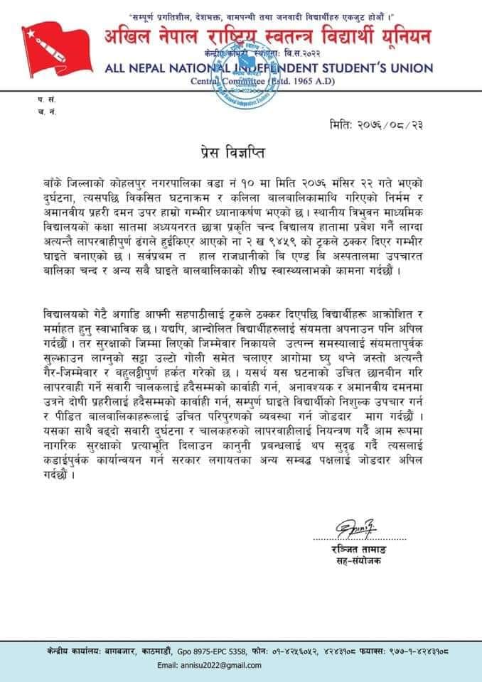 काठमाडौँ — सत्तारुढ दल नेपाल कम्युनिष्ट पार्टी (नेकपा) को विद्यार्थी संगठन अनेरास्ववियुका सह–संयोजक रन्जित तामाङले कोहलपुरमा विद्यार्थीमाथि लाठी प्रहार गर्ने प्रहरीमाथि कारबाहीको माग गरेका छन् ।