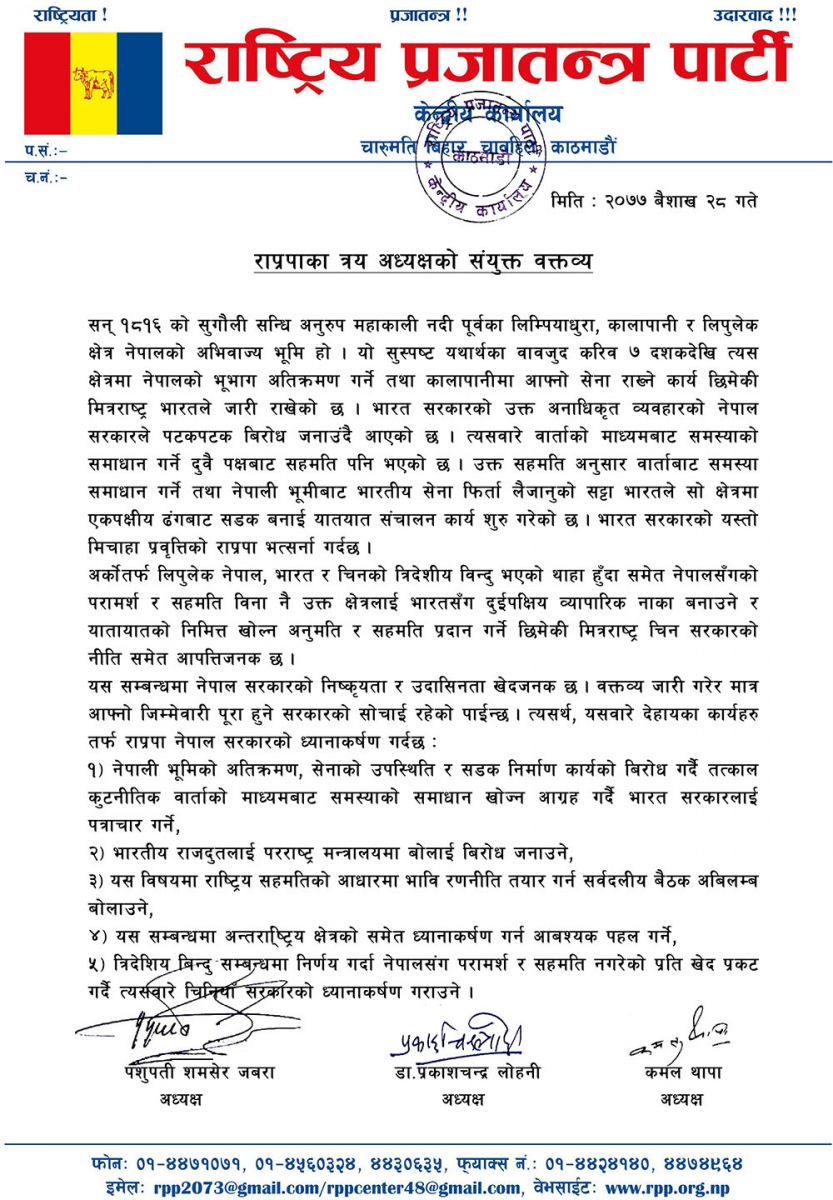 राप्रपाका तीनै अध्यक्षद्वारा हस्ताक्षरित विज्ञप्तिमा सन् १८१६ को सुगौली सन्धिअनुसार महाकाली नदी पूर्वका लिम्पियाधुरा, कालापानी र लिपुलेक क्षेत्र नेपालको अभिवाज्य भूमि रहेको उल्लेख गरिएको छ ।
