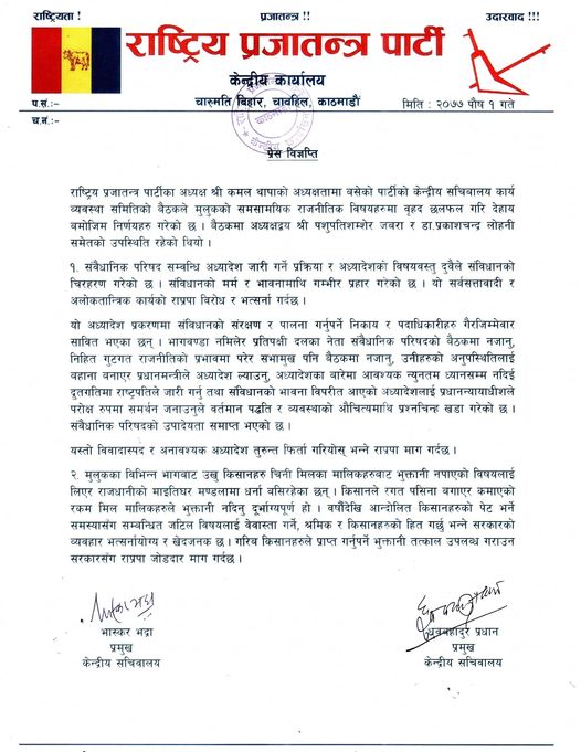 काठमाण्डु – राष्ट्रिय प्रजातन्त्र पार्टी (राप्रपा)ले मंगलबार जारी भएको संवैधानिक परिषद् सम्बन्धी अध्यादेश फिर्ता गर्न माग गरेको छ ।