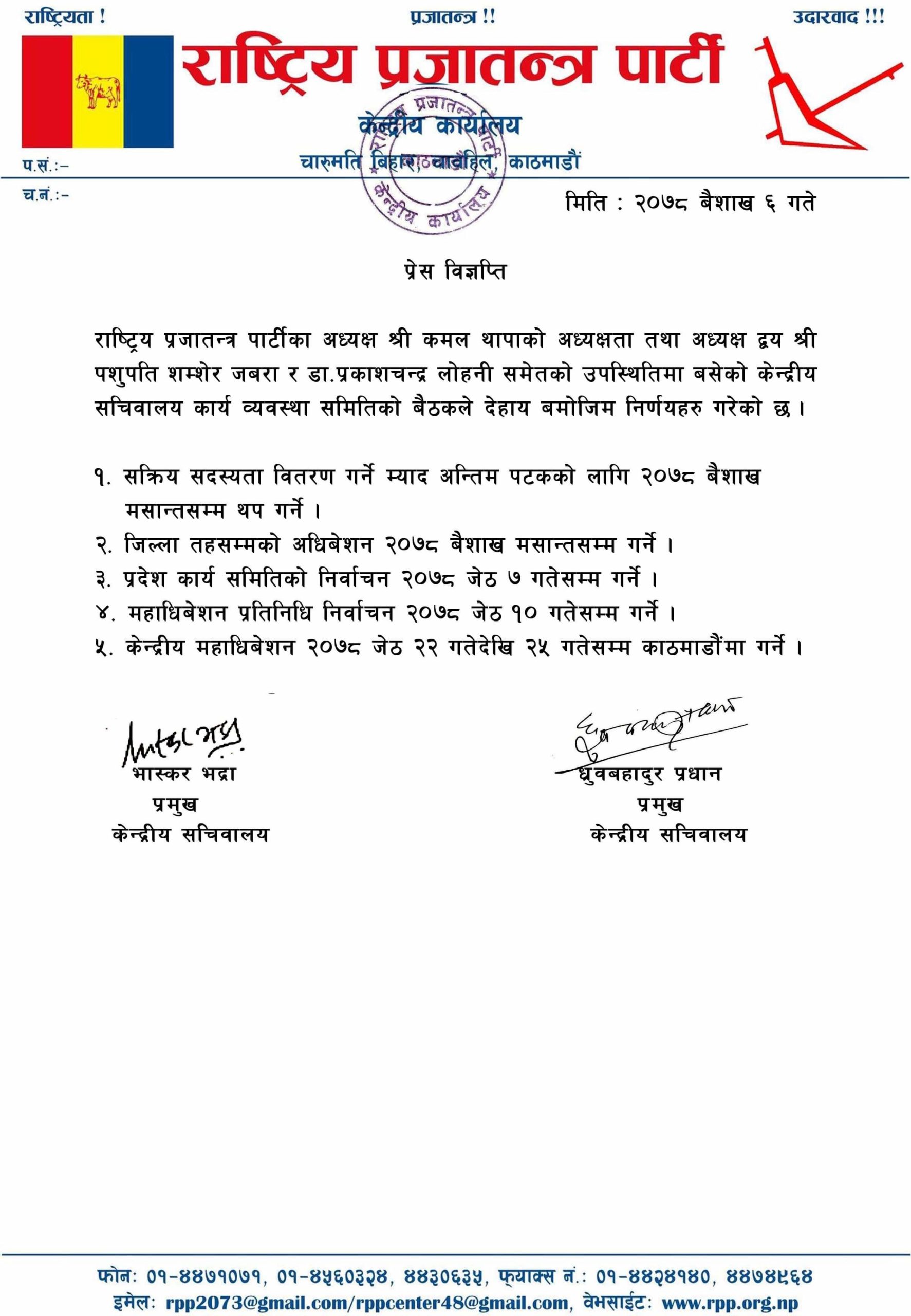 बैठकले सक्रिय सदस्यता वितरण गर्ने म्याद बैशाख मसान्तसम्म थप गरेको छ । त्यस्तै जिल्ला तहसम्मको अधिवेशन बैशाख मसान्तसम्म, प्रदेश कार्य समितिको निर्वाचन जेठ ७ गतेसम्म, महाधिवेशन प्रतिनिधि निर्वाचन २०७८ जेठ १० गतेसम्म र केन्द्रीय महाधिवेशन जेठ २२ गतेदेखि २५ गतेसम्म काठमाण्डुमा गर्ने निर्णय सचिवालय बैठकले गरेको छ ।