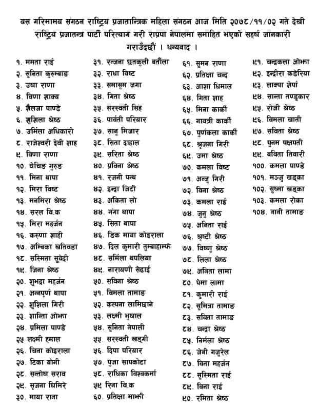 पार्टीका पूर्व अध्यक्ष थापाले राप्रपा नेपाल नामक नयाँ दल खोलेपछि राप्रपामा पहिरो जान थालेको हो । हिजो मात्रै राप्रपाबाट १ सय ४ महिला कार्यकर्ता राप्रपा नेपालमा प्रवेश गरेका हुन् । संगठनले विज्ञप्तिमार्फत पार्टी छाडेको जानकारी गराउँदै राप्रपा नेपालसँग जोडिएको बताएका छन् ।