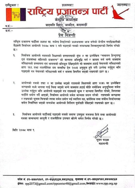 काठमाण्डु – राष्ट्रिय प्रजातन्त्र पार्टी (राप्रपा)ले हिन्दु राष्ट्र, राजसंस्था, पार्टीको झन्डाबारे निर्वाचन आयोगलाई उपयुक्त समयमा जवाफ दिने भएको छ ।
