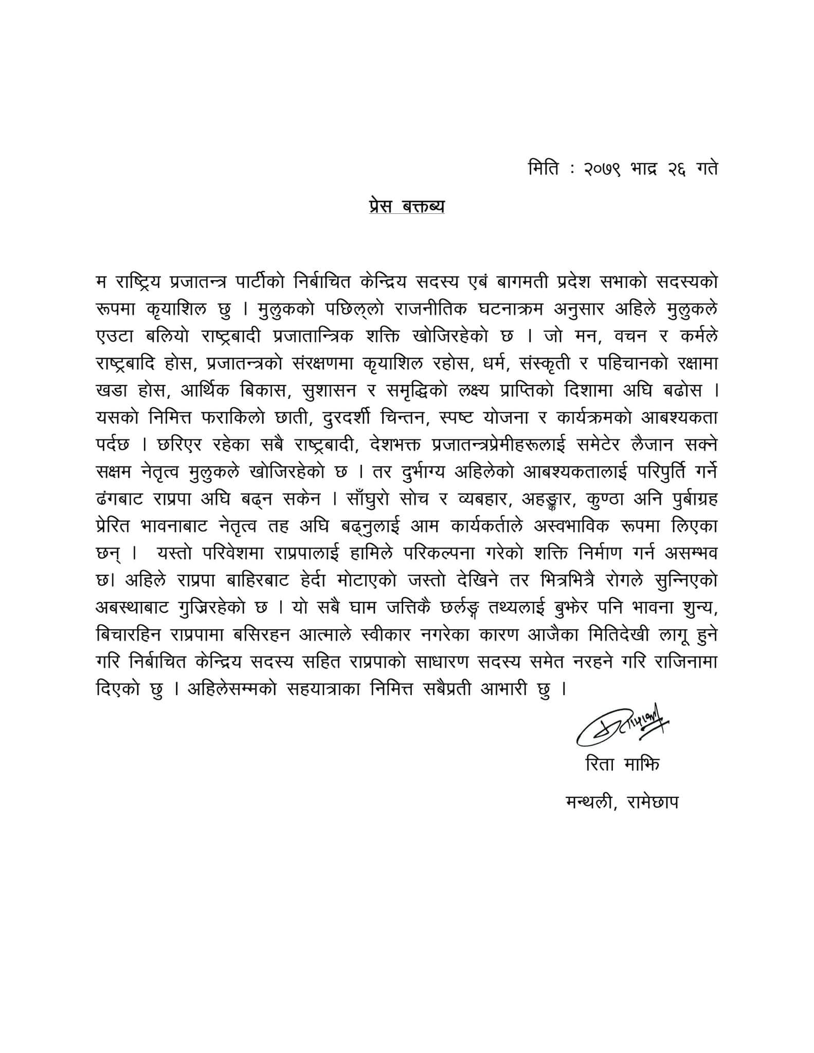 ‘भावनाशून्य, विचारहीन राप्रपामा बसिरहन आत्माले स्वीकार नगरेका कारण आजैका मितिदेखि लागू हुने गरि निर्वाचित केन्द्रीय सदस्यसहित राप्रपाको साधारण सदस्य समेत नरहने गरि राजीनामा दिएको छु’ उनले विज्ञप्तिमा भनेकी छन् ।