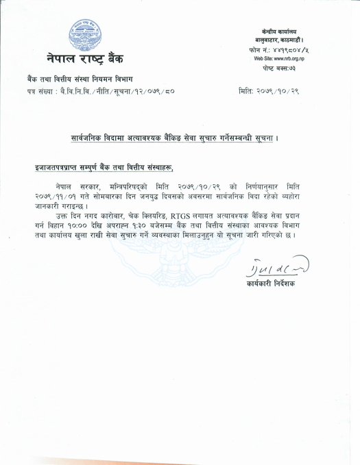 ‘नगद कारोबार, चेक क्लियरिङ, अारटिजिएसलगायत बैंकिङ सेवा प्रदान गर्न बिहान ११ बजे देखी अपरान्ह १ बजेसम्म बैंक तथा बित्तिय संस्थाका आवाश्यक बिभाग तथा कार्यालय खुला राखी सेवा सुचारु गर्ने ब्यबस्था मिलाउन हुन यो सुचना जारी गरिएको छ,’ राष्ट्र बैंकले जारी गरेको बिज्ञप्तिमा भनिएको छ ।