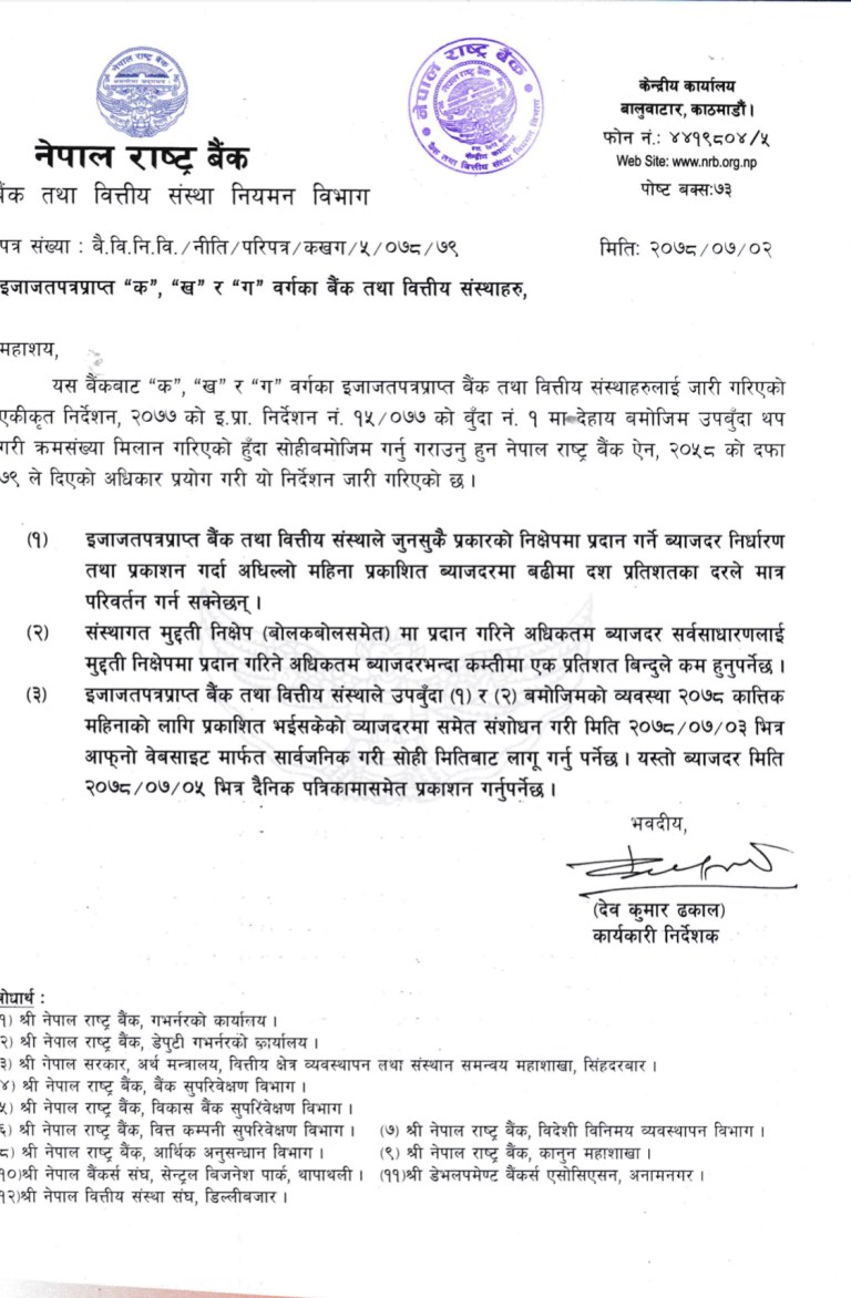 राष्ट्र बैंकको नयां निर्देशनअनुसार अव बैंकहरुले ब्याजदर परिवर्तन गर्दा अघिल्लो महिनाको तुलनामा १० प्रतिशतभन्दा बढी बढाउन वा घटाउन पाउने छैनन् । यस्तै व्यक्तिगत तर्फको मुद्दती निक्षेपको ब्याजदर संस्थागतभन्दा १ प्रतिशत बिन्दुले बढी हुनुपर्ने छ ।