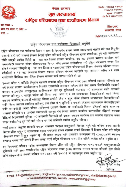 साथै विभागले सम्भव भएसम्म आफ्नो जिल्लामा नै विवरण प्रविष्ट गरी राष्टिय परिचयपत्र नम्बर लिन पनि अनुरोध गरेको छ । गत १ मंसिरदेखि विद्युतीय राहदानी बनाउँदा राष्ट्रिय परिचयपत्र नम्बर अनिवार्य गरिएकाले सेवाग्राहीको चाप बढेको बताएको विभागले हालसम्म ५२ लाख नागरिकको वैयक्तिक तथा जैविक विवरण संकलन गरिसकेको जनाएको छ ।