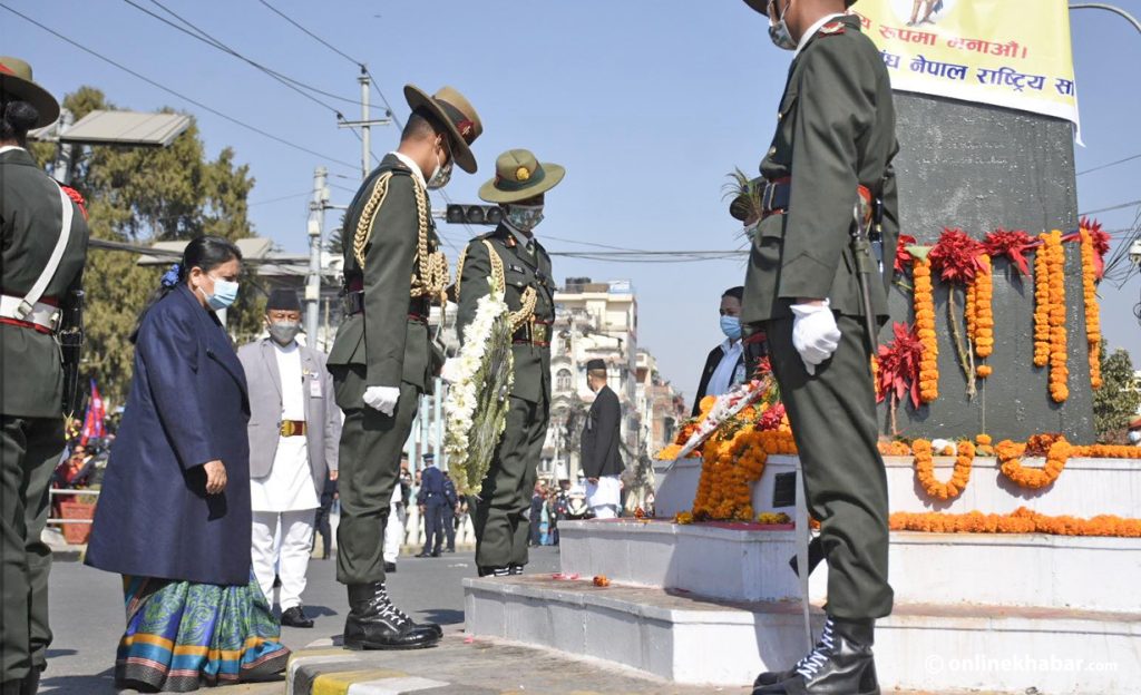 काठमाण्डु- राष्ट्रपति विद्यादेवी भण्डारीले पृथ्वीनारायण शाहको शालिकमा मल्यार्पण गरेकी छन् । बुधबार राष्ट्रपति भण्डारीले सिंहदरबार पश्चिम गेट अगाडि रहेको पृथ्वीनारायण शाहको शालिकमा माल्यार्पण गरेकी हुन् ।
