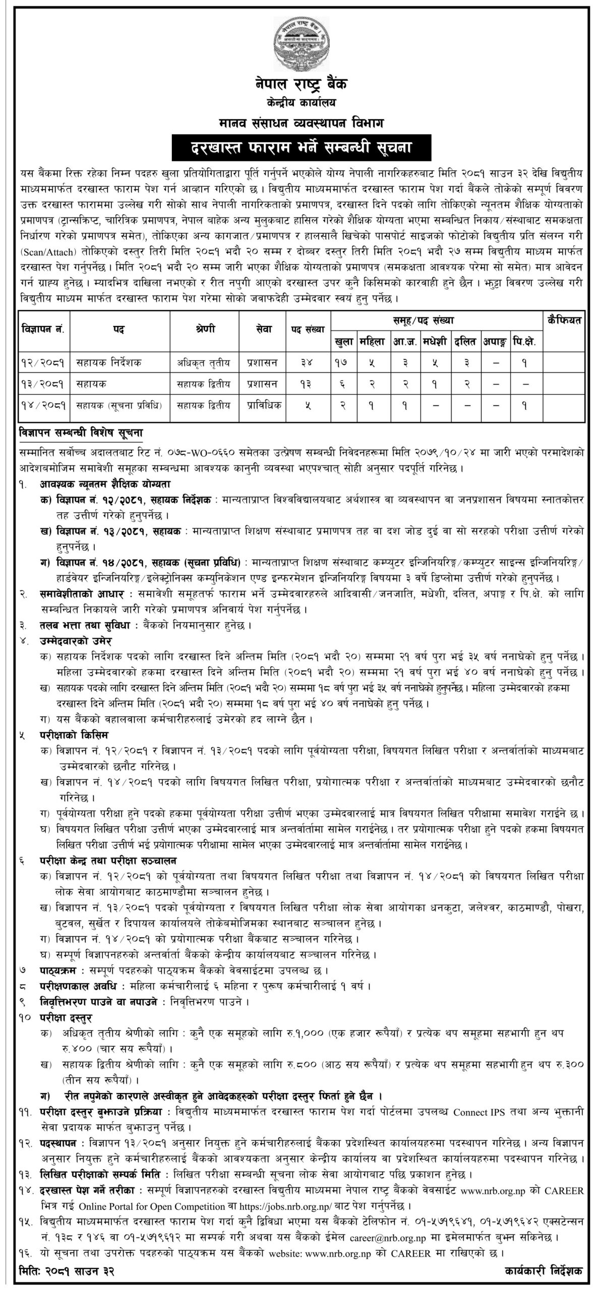 विद्युतीय माध्यममार्फत दरखास्त फाराम पेस गर्दा बैंकले तोकेको सम्पूर्ण विवरण उक्त दरखास्त फाराममा उल्लेख गरी सोको साथ नेपाली नागरिकताको प्रमाणपत्र, दरखास्त दिने पदको लागि तोकिएको न्यूनतम शैक्षिक योग्यताको प्रमाणपत्र (ट्रान्सक्रिप्ट, चारित्रिक प्रमाणपत्र, नेपाल बाहेक अन्य मुलुकबाट हासिल गरेको शैक्षिक योग्यता भएमा सम्बन्धित संस्थाबाट समकक्षता निर्धारण गरेको प्रमाणपत्र समेत), तोकिएका अन्य कागजातसहित आगामी भदौ २० सम्म आवेदन दिन सकिने सूचनामा उल्लेख छ ।
